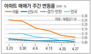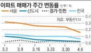 서울 아파트값 상승 폭이 8주 연속 줄었다. 전세금 하락 폭은 더 커졌다.8일 부동산114에 따르면 지난주 서울 아파트값 상승률은 0.16%로 집계됐다. 전주(0.24%)보다 상승률이 0.08%포인트 감소했다. 이달부터 다주택자 양도세 중과가 시행되면서 집을 팔려는 사람과 사려는 사람 모두 관망세를 보이고 있다. 3월 마지막 주 0.27%였던 일반 아파트값 상승률은 지난주 0.14%로 떨어졌다. 재건축 아파트값 상승 폭은 관리처분인가를 앞둔 강남구 개포주공1단지 거래가 늘면서 커졌다(0.11%→0.27%).신도시의 경우 평촌(0.05%), 분당(0.03%), 동탄(0.01%) 등을 제외하고는 모두 아파트값이 제자리걸음하며 전체적인 상승 폭(0.02%)은 전주(0.03%)보다 줄었다. 경기· 인천은 전주와 마찬가지로 0.02% 올랐다.전세시장 하락세는 꾸준히 이어지고 있다. 서울 전세금 상승률은 ―0.03%에서 ―0.05%로 커졌으며 신도시(―0.07%)와 경기·인천(―0.03%)도 하락 폭이 더 커졌다.강성휘 기자 yolo@donga.com}