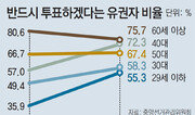 12일로 하루 앞으로 다가온 4·13 국회의원 총선거에서 “반드시 투표하겠다”는 적극 투표층이 늘면서 20년 만에 총선 투표율이 60%를 넘을 수 있다는 관측이 나오고 있다. 역대 총선에서 투표율 60% 이상을 기록한 것은 1996년 15대 총선(63.9%)이 마지막이었다. 특히 20대, 30대, 40대에서 적극 투표층이 크게 늘면서 실제 투표로 어느 정도 이어질지 주목된다. 중앙선거관리위원회가 3, 4일 실시해 11일 발표한 투표 참여 의향 설문조사에 따르면 응답자의 66.6%가 이번 총선에서 “반드시 투표하겠다”고 답했다. 선관위가 지난달 21, 22일 실시한 조사 때의 63.9%에 비해 약 열흘 사이에 2.7%포인트 증가했다. 이번 총선에서 적극 투표층 증가는 선관위가 2012년 19대 총선을 앞두고 실시한 같은 조사와 비교해도 두드러진다. 당시 조사에서 적극 투표층은 58.1%로 집계됐고, 실제 투표율은 54.2%로 나타났다. 이는 이번 선거가 마지막까지 유례없는 혼전 양상을 보이면서 유권자들의 관심이 높아진 데 따른 것으로 보인다. 또 이번 조사에서 60세 이상 노년층의 적극적인 투표 참여 의사가 감소한 반면 20대와 30대, 40대에서 적극 투표층이 크게 늘어 선거 결과에 중대 변수가 될 가능성이 높아졌다. 19대 총선 직전 조사 때 35.9%에 불과했던 20대 적극 투표층은 이번 조사에서 55.3%로 20%포인트 가까이 증가했다. 30대 적극 투표층은 49.4%에서 58.3%로 9%포인트가량, 40대 적극 투표층은 57.0%에서 72.3%로 15%포인트가량 늘었다. 20대와 30대, 40대 적극 투표층이 늘어난 것은 외형상 야권에 유리할 수 있는 지표라고 전문가들은 보고 있다. 특히 수도권은 40대 유권자(약 400만 명)가 가장 많아 이들의 표심이 전체 판세에도 영향을 줄 가능성이 높다는 것이다. 다만 박명호 동국대 정치외교학과 교수는 “무당층, 중도층이 주축인 40대는 야권 성향이 더 강하다 해도 야권 분열로 인해 어느 한쪽으로 쏠린다고 볼 수는 없다”고 말했다. 40대가 야권 분열의 중추적 역할을 하면서 결과적으로 여당이 이득을 볼 수도 있다는 얘기다. 더불어민주당 관계자는 “60대 이상 유권자(984만 명)가 가장 많고 실제 투표율도 높을 가능성이 커 여전히 여당에 유리한 구도”라고 말했다.한상준 기자 alwaysj@donga.com}