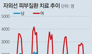 여름철은 강한 자외선 때문에 피부질환이 급증하는 시기여서 야외 활동 시 주의가 요구된다. 26일 건강보험심사평가원이 ‘자외선으로 인한 기타 급성 피부변화’ 관련 자료를 분석한 결과 지난해 관련 질환으로 진료를 받은 환자 수는 2만1000명, 진료비용은 5억5000만 원에 이르는 것으로 집계됐다. 환자 수는 2012년 이후 소폭 감소하고 있지만 총진료비는 지난해보다 약 850만 원(1.6%)이 늘어났다. ‘햇볕 알레르기’로 불리기도 하는 자외선 피부질환은 두드러기, 발진, 수포 등의 증상이 나타나고 심한 경우 일광화상으로 이어지거나 쇼크가 나타날 수도 있다. 이런 질환으로 치료받는 환자는 5월부터 증가하기 시작해 7, 8월에 가장 많다. 지난해 환자가 가장 많았던 달은 7월(약 4700명)로, 가장 적은 12월의 7.6배에 달했다. 연령별로는 절반 이상이 30∼50대에서 발생했고 특히 40대가 전체의 20.4%로 가장 많았다. 성별로 따져보면 남성보다 여성이 많았다. 노출이 상대적으로 많은 여성들의 의상, 피부에 대한 관심 등이 영향을 미친 것으로 분석된다. 자외선으로 인한 피부질환을 예방하려면 야외 활동 시 긴 옷과 모자를 착용하고 자외선 차단제를 바르는 게 좋다. 기상청 홈페이지에서 제공하는 자외선 지수를 확인해 지수가 높은 날은 야외 활동을 줄이고, 피부가 붉어지는 증세가 계속되면 의사의 진료를 받아야 한다. 서울대병원 가정의학과 박민선 교수는 “선크림은 보통 2시간 간격으로 두껍게 발라주는 게 효과가 있다”며 “여름철 몸 전체에 바르는 경우는 보통 30mL 정도를 한 번에 사용한다”고 말했다. 건강보험심사평가원의 문기찬 전문심사위원은 “일광화상과 홍반은 주로 UV-B 파장에 의해, 색소 침착은 UV-A에 의해 발생하는데 경우에 따라 UV-A에 의해서도 심한 홍반이나 두드러기가 생길 수 있다”며 “선크림은 A와 B 파장 모두에 작용하는 제품을 사용하는 게 좋다”고 말했다. 이정은 기자 lightee@donga.com}