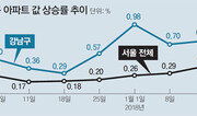 정부의 대대적인 투기 단속에도 서울 아파트값 상승세는 누그러지지 않고 있다. 오히려 강남과 가까운 서울 인근 수도권 지역으로 오름세가 번지는 추세다. 21일 부동산114에 따르면 지난주 서울 아파트값은 0.53% 올랐다. 정부와 서울시의 투기단속과 국세청 세무조사에도 전주 상승률(0.57%)과 비슷한 수준을 유지했다. 정부의 집중 타깃이 된 서울 재건축 아파트 상승률은 지난주 0.93%로 전주(1.17%)보다 낮아졌다. 일반아파트 상승률은 0.45%로 전주와 같은 수준이다. 지역별로는 송파(1.47%), 강동(1.11%), 서초(0.81%), 성동(0.62%), 강남구(0.59%) 등 강남3구(강남, 서초, 송파구) 및 그 인접 지역이 많이 올랐다. 신도시 아파트값은 0.32% 뛰며 상승폭이 전주(0.15%)의 두 배를 넘겼다. 서울 강남과 가까운 분당이 1.12% 올라 신도시 아파트값 상승세를 견인했다. 판교(0.19%), 광교(0.16%) 등을 제외한 일산, 산본, 중동, 위례는 아파트값이 제자리걸음(0.00%)을 했다.강성휘 기자 yolo@donga.com}