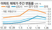 서울 집값 상승세가 소폭 꺾였다. 재건축 조합원 1인당 최대 8억4000만 원의 부담금을 내게 될 수 있다고 발표한 정부의 ‘충격요법’이 일부 먹혔다는 분석이다. 28일 부동산114에 따르면 지난주 서울 아파트값 상승률은 0.43%로 전주(0.53%)보다 0.1%포인트 떨어졌다. 정부의 ‘재건축 부담금’ 시뮬레이션 발표 충격을 직격으로 맞은 재건축 단지 상승률은 0.93%에서 0.79%로 둔화됐다. 특히 초과이익환수제 적용 대상 단지가 몰린 송파(1.88%→0.54%), 서초구(0.80%→0.17%)의 상승률이 크게 줄었다. 반면 초과이익환수제를 피한 단지가 많은 강남구는 지난주 상승 폭(1.00%)이 한 주 전(0.68%)보다 커졌다. 재건축 아파트값이 주춤하자 지난주 서울 일반 아파트 상승률(0.36%) 역시 전주(0.45%)에 비해 떨어졌다. 분당 등 서울 강남과 가까운 신도시들이 강세를 보이며 1월 셋째 주 0.32%까지 뛰었던 신도시 아파트값 역시 지난주 0.24% 오르며 상승 폭이 한풀 꺾인 모습을 보였다.강성휘 기자 yolo@donga.com}