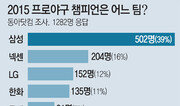 2015시즌 프로야구 개막을 앞두고 많은 전망이 쏟아지고 있다. 뚜껑을 열어봐야 확실해 지겠지만 일단 요즘 분위기를 사자성어로 풀이해 보면 ‘이구동성’이다. 우승 후보를 묻는 질문에 야구 전문가, 해설위원, 팬들 모두 삼성을 꼽았다. 동아일보가 동아닷컴(www.donga.com) ‘핫 이슈-당신의 의견은’ 코너를 통해 실시한 ‘올 시즌 프로야구 우승 팀’을 묻는 설문에서도 삼성은 1282명의 응답자 중 가장 많은 502명(39%)의 지지를 얻었다. 우승 후보 2위는 지난해 삼성과 한국시리즈에서 맞붙었던 넥센으로 전체 응답자 중 16%인 204명으로부터 표를 받았다. 넥센을 지지한 한 누리꾼은 “배영수, 밴델헬크 등 에이스급 투수가 빠진 삼성은 올해 조금 힘들 것 같다. 반면 넥센은 강정호가 빠졌지만 홈런왕 박병호를 비롯한 거포들이 즐비하다”고 평가했다. LG가 넥센의 뒤를 이었으며 한화가 네 번째를 차지한 것도 눈길을 끌었다. ‘야신’ 김성근 감독이 지휘봉을 잡은 한화는 스프링 캠프에서 입에서 단내가 풀풀 나는 지옥 훈련을 통해 선수들의 결집력을 끌어올렸다. 누리꾼들은 설문 조사에서 달라진 한화에 대한 기대심리를 드러낸 것으로 보인다. 골수팬이 많기로 유명한 롯데는 5위를 차지했다. 전문가 예상에서 정상을 넘볼 강호로 분류된 SK가 9위에 처진 것도 의외다. 유력한 최하위로 분류되는 신생 팀 kt는 응답자 중 1%인 10명만이 우승 후보로 지목했다. 심판의 “플레이 볼” 구호가 시작될 날이 하루 앞으로 다가왔다. 공은 둥글고 어디로 날아갈지 모른다. 예상은 그저 참고자료에 불과할 수도 있다.김종석 기자 kjs0123@donga.com}
