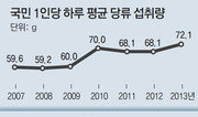 서울의 한 초등학교 5학년생 김모 군(12)은 탄산음료 마니아다. 친구들과 농구나 축구를 한 뒤 자판기에서 탄산음료를 사서 마시는 게 습관이 됐다. 달콤한 맛에 익숙해지면서 빈도와 양도 늘었다. 김 군의 키는 145cm, 몸무게는 70kg. 또래와 비교했을 때 고도비만에 해당한다. 김 군처럼 단맛을 내는 당 성분이 들어간 음료수를 많이 마시는 청소년과 어린이가 지속적으로 늘고 있는 추세다. 7일 식품의약품안전처에 따르면 우리나라 어린이·청소년·청년층(3∼29세)이 가공식품을 통해 섭취하는 당류의 양은 2013년에 이미 적정 기준(총섭취 열량 대비 10% 이내)을 넘어섰다. 지금은 더 늘었을 것으로 추정된다. 정부가 이날 2020년까지 5년간 대대적으로 시행할 ‘당류 저감 종합계획’을 내놓으며 사실상 ‘설탕과의 전쟁’을 선포한 것은 이런 현황에 대한 문제의식에서 비롯됐다. 2015년 식약처 조사 결과 우리 국민의 하루 평균 총당류 섭취량(약 72.1g)은 총열량 섭취량의 14.7% 수준으로 2007년(13.3%)보다 늘었다. 과일 같은 천연식품이 아닌 가공식품을 통한 당류 섭취는 44.7g(총섭취 열량의 8.9%)으로 세계보건기구(WHO)의 권고량 미만이지만 역시 지속적으로 증가하는 추세다. 연간 증가율이 평균 5.8%에 이른다. 특히 음료수를 통한 당류 섭취량은 2007년 14.6%에서 2010년 18.6%, 2013년에는 19.3%까지 치솟았다. 식약처는 이런 흐름이 이어질 경우 2016년에 어린이와 청소년뿐 아니라 전체 국민이 가공식품을 통해 섭취하는 당류 양이 기준을 초과할 것으로 보고 있다. 당류 섭취의 증가는 만성질환의 증가로 이어진다. 가공식품의 당류 섭취량이 하루 열량의 10% 이상인 사람은 그렇지 않은 사람보다 비만해질 가능성이 39%, 고혈압과 당뇨에 걸릴 확률은 각각 66%, 41% 더 높다. 비만과 고혈압, 당뇨병 등 만성질환으로 인해 발생하는 사회, 경제적 비용이 연간 6조8000억 원(2016년)에 달한다는 국민건강보험공단의 조사 결과도 있다. 손문기 식약처장은 “늘어나는 당류 섭취 추세를 감안할 때 국민의 식습관 개선을 비롯해 당류를 적정 수준 섭취할 수 있도록 선제적, 체계적으로 관리할 필요가 있다”고 말했다. 정부는 당류 섭취량을 줄이기 위해 영양성분 기준치 대비 당류 함량 표시를 의무화하는 조치와 함께 △단체 급식소 및 보육시설 등의 식단 모니터링 △요리 전문가와 함께 당류를 줄일 수 있는 메뉴 개발 및 보급 △당류 섭취량과 만성질환의 관련성 연구 및 관련 데이터베이스(DB) 구축 등을 시행해 나갈 방침이다. 또 시럽 및 탄산음료 줄이기 같은 당류 줄이기 캠페인 및 교육을 병행하기로 했다. 전문가들은 대체적으로 “시의적절한 정책”이라고 평가했다. 그러나 ‘저(低)당’ 식품의 표시·광고를 허용하면 자칫 영양성분이 불균형한 제품을 건강식품으로 포장해주는 꼴이 될 수 있다는 우려도 나왔다. 김경우 서울백병원 가정의학과 교수는 “WHO가 최근 가공식품 당류를 통한 열량 섭취 기준을 1일 5%로 강화한 것에 비춰 식약처의 기준은 좀 낮은 편”이라고 지적했다.이정은 기자 lightee@donga.com}