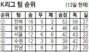 프로축구 정규리그가 막바지를 향해 가고 있다. 이제 남은 경기는 팀당 6경기. 하지만 플레이오프에 나갈 6강은 여전히 안갯속이다. 10위 팀도 6경기를 통해 얼마든지 6강행 티켓을 얻을 수 있다. 선두 전북(승점 53)은 느긋하다. 최근 6경기 무패(5승 1무)를 달리고 있는 만큼 팀 분위기도 상승세다. 다만 14일부터 아시아축구연맹(AFC) 챔피언스리그 8강전이 열려 체력적인 문제가 있다. 하지만 이미 6강행 마지노선은 넘어섰다. 2위 포항(승점 46)과 3위 서울(승점 42)도 안정권이다. 포항은 10일 광주와의 홈경기에서 5-1로 대승을 거두며 2연승을 달렸다. 두 팀은 남은 경기에서 2경기만 이긴다면 플레이오프 진출이 유력하다. 1∼3위 팀과는 달리 4위부터는 언제든지 자리가 바뀔 수 있다. 4위 수원과 5위 전남, 6위 부산은 승점 39점으로 같다. 세 팀은 주말 경기에서 나란히 이기며 승점 3점씩을 챙겼다. 수원은 10일 성남을 3-2로 꺾었다. 부산과 전남은 11일 각각 대전과 경남을 상대로 1-0, 2-0으로 이겼다. 세 팀은 골득실 차로 앞서거니 뒤서거니 하고 있다. 7위 제주(승점 35)는 이들과 승점 4점차에 불과하다. 하지만 전북, 포항, 수원 등 강팀과 경기를 남겨두고 있어 쉽지만은 않은 상황이다. 8위 경남, 9위 울산(이상 승점 32)과 10위 인천(승점 30)도 남은 경기에서 승점을 차곡차곡 쌓는다면 6강행 불씨를 이어갈 수 있다. K리그 마지막 경기가 열리는 다음 달 30일 어느 팀이 웃고 울지 주목된다.김동욱 기자 creating@donga.com}