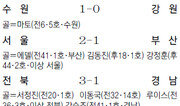 6위와 7위. 순위 차이는 한 계단에 불과하다. 하지만 대접은 극과 극이다. 6위까지는 플레이오프에 진출하고 그 아래 팀부터는 TV에서 플레이오프를 지켜봐야 한다. 17, 18일 K리그 8경기가 열렸다. 남은 경기는 팀마다 6경기. 6위 안과 밖을 놓고 많은 팀이 사투를 벌였다. 결과는 6위 입성을 노렸던 팀들은 좌절했고, 6위 안의 팀들은 안도의 숨을 내쉬었다. 서울은 짜릿한 역전승을 거두며 3위를 지켰다. 서울은 18일 서울월드컵경기장에서 열린 부산과의 홈경기에서 1-1로 맞선 후반 종료 1분 전 강정훈의 역전골이 터져 승리를 거뒀다. 서울은 부상과 경고 누적으로 주전 선수 6명이 빠졌지만 살얼음판 6강 싸움에서 집중력을 잃지 않고 귀중한 승점을 챙겼다. 승점 45점(13승 6무 6패)으로 3위 자리를 지킨 서울은 2002년 5월부터 9년간 부산을 상대로 한 홈경기 무패 행진(13경기)도 이어갔다. 서울은 전반 41분 부산 에델에게 헤딩슛을 허용했지만 후반 18분 김동진이 골문 앞 혼전 상황에서 침착하게 동점골을 만들며 추격의 발판을 마련했다. 이어 강정훈의 역전골로 소중한 승리를 챙겼다. 반면 부산은 이날 패배로 불안한 6위에 그쳤다. 11승 6무 8패(승점 39점)로 전남(승점 40점·5위)과 1-1로 비긴 7위 제주(승점 36점)와의 승점이 3점 차로 좁아졌다. 4위 수원은 최하위 강원을 제물로 4위를 유지했다. 수원은 강릉에서 열린 방문경기에서 강원을 1-0으로 이겼다. 수원은 13승 3무 9패로 승점 3점을 보태며 승점 42점을 기록했다. 수원은 전반 6분 페널티 지역 오른쪽 밖에서 얻은 프리킥 기회에서 염기훈의 슈팅을 마토가 방향을 살짝 바꿔 골망을 흔들었다. 선두 전북은 6위 진입을 노리던 경남을 꺾고 1위 자리를 굳건히 했다. 전북은 창원에서 열린 방문경기에서 1골 1도움을 올린 이동국의 활약에 힘입어 3-1로 이겼다. 전북은 17승 5무 3패(승점 56점)를 기록하며 2위 포항(승점 49점)과의 승점 차를 7점으로 유지했다. 경남은 이날 패배로 9승 5무 11패(승점 32점)를 기록하며 남은 경기에서 최대한 승수를 많이 쌓아야 6강 진입 불씨를 살릴 수 있다.김동욱 기자 creating@donga.com}