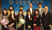 2010년 동아일보 신춘문예 시상식이 20일 오후 3시 서울 중구 태평로 한국프레스센터 20층 국제회의장에서 열렸다. 이날 시상식에서 당선자 정유경(중편소설) 김미선(단편소설) 유병록(시) 박해성(시조) 전신우(동화) 임나진(희곡) 최영주(시나리오) 박은주(문학평론 가작) 유지원 씨(영화평론)가 상패와 상금을 받았다. 당선자들은 저마다 등단에 얽힌 사연을 떠올리며 당선소감을 밝혔다. 올해 최연장자로 등단한 박해성 씨(63)는 “모두 늦었다고 말했지만 시에 미쳐 있었다”며 “사회가 나이에 호의적이지는 않았지만 문학이란 양이 아니라 질로 평가받는 예술이라고 믿는다”고 말했다. 전신우 씨(36)는 “동화작가 같지 않은 얼굴, 동화 같지 않은 제목으로 당선돼 기쁘다”며 “당선 전화를 받은 뒤 모든 게 동화가 될 것 같은 생각으로 한 달을 보냈다”고 말해 웃음을 자아냈다. 문학평론가 권영민 서울대 교수는 격려사에서 “신춘문예는 100년 가까이 된 제도이며 동아일보는 일찍부터 신춘문예 정착을 위해 노력하면서 수많은 문인을 배출해왔다”며 “그 화려한 대열의 주자가 된 당선자들을 축하한다”고 말했다. 시상이 끝난 뒤에는 시를 모티브로 국악을 창작하는 4인조 국악프로젝트그룹 ‘시로’의 축하공연이 이어졌다. 시상식에는 당선자의 가족 친지를 비롯해 심사를 맡았던 문학평론가 김인환 고려대 교수, 정과리 연세대 교수, 소설가 한강 씨, 시인 김혜순 서울예대 교수, 이근배 박형준 씨, 아동문학평론가 김경연 씨, 영화평론가 정지욱 씨, 극작가 김명화 씨와 동아일보 문학회 회원 200여 명이 참석했다. 박선희 기자 teller@donga.com김민정 인턴기자 한국외대 영어통번역학과 4학년}
