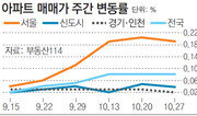 ‘10·24 가계부채 종합대책’ 발표가 있었던 지난주에도 서울 아파트값 상승세가 이어졌다. 29일 부동산114에 따르면 지난주 서울 아파트값은 0.19% 오르며 전주(0.20%)와 비슷한 오름 폭을 유지했다. 정부 대책이 기존에 예고됐던 내용에서 크게 벗어나지 않으면서 당장 주택시장에 큰 영향을 주지는 않았다는 분석이다. 오히려 일부 저가 매물이 거래된 서울 재건축 아파트값은 0.26% 오르며 전주(0.23%)보다 상승폭을 키웠다. 지역별로는 송파(0.41%), 강북(0.37%), 강동(0.27%), 강서구(0.27%) 순으로 많이 올랐다. 반면 지난주 신도시 아파트값은 0.03% 오르는 데 그치며 전주(0.05%)보다 상승률이 낮아졌다. 경기·인천 역시 거래가 줄면서 전주(0.03%)보다 0.01%포인트 낮은 0.02% 올랐다. 전세시장은 안정세를 이어가고 있다. 지난주 서울 전세금 상승률은 0.06%로 전주(0.09%)보다 0.03%포인트 떨어졌다. 신도시와 경기 인천의 전세금은 각각 0.01%, 0.02% 하락했다.강성휘 기자 yolo@donga.com}