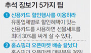 추석(30일)이 사흘 앞으로 다가왔다. 한국농수산식품유통공사가 최근 추산한 추석 차례상 비용은 26만2232원. 가족과 지인들에게 보낼 선물까지 감안하면 비용은 더 불어난다. 장보기에 앞서 유통업체들의 할인 행사와 배송 일정 등을 알아두면 싸고 좋은 제품을 편리하게 살 수 있다.○ 신용카드 할인 꼼꼼히 따져라 유통업체별로 제휴된 신용카드로 결제하면 선물세트를 최대 30% 싸게 사고 구매금액에 따라 상품권도 받을 수 있다. 홈플러스는 다음 달 1일까지 신한·KB·삼성·우리·외환·하나SK카드로 ‘사과·배 혼합 선세트’ ‘동원 혼합 5호’ 등 75개 선물세트를 사는 고객에게 최대 30%를 할인해주거나 덤 상품을 준다. 세븐일레븐은 롯데카드와 BC카드로 결제하는 고객에게 10%를 할인해준다. 또 마이신한포인트를 사용하면 구매금액의 최대 30%, BC탑포인트와 현대M포인트를 쓰면 최대 20%를 할인받을 수 있다.○ 온라인은 배송 끝, 오프라인 이용하라 GS샵과 현대홈쇼핑, G마켓, 옥션, 11번가 등 홈쇼핑과 오픈마켓 대부분이 26일 택배 접수를 마감했다. 27일부터는 주문을 해도 연휴가 끝난 뒤에 받을 수 있다. 단, CJ오쇼핑은 27일 오후 6시 전까지 주문한 상품에 대해 추석 전까지 배송해준다. 시기를 놓쳤다면 대형마트와 대기업슈퍼마켓(SSM)을 이용하자. 이마트와 롯데슈퍼 등은 배송지가 점포 인근에 있는 경우 추석 전날까지 선물세트를 배송해준다. 소비자가 제품을 고르면 배송지 인근에 있는 점포에서 동일한 상품을 골라 보내는 방식이다. 이마저도 어렵다면 귀성길 편의점에 들르자.○ 막판 떨이를 공략하라 추석 직전에 유통업체들은 특별 할인행사를 시작한다. 롯데마트는 27일부터 제수용품을 최대 50% 싸게 판다. ‘제수용 국거리 한우’(1등급 이상·100g)는 시세보다 약 17% 싼 2900원, ‘제수용 큰 토종닭’(1마리·1.7kg)은 반 값 정도인 8800원이다. 롯데슈퍼는 기존 ‘CJ스팸 R호’ ‘청정원 팜 고급유 세트 LS 1호’ ‘애경 누리세트 3호’ ‘아모레 고운세트 6호’에 대해 10개를 사면 하나를 더 줬지만 26일부터 5개만 사도 1개를 덤으로 준다. 백화점에서 집으로 보내는 직접우편(DM)에 나와 있는 쿠폰 상품은 대형마트와 가격이 비슷하거나 오히려 싸다.○ 맘에 안 드는 선물은 일주일 내 교환 처치 곤란인 선물은 백화점과 대형마트에 가면 상품권이나 다른 제품으로 바꿀 수 있다. 롯데백화점과 신세계백화점 이마트는 같은 금액의 상품권으로 바꿔주고, 현대백화점 롯데마트 홈플러스는 같은 가격의 다른 상품으로 교환해준다. 업체별로 교환 가능한 기간이 달라 추석 이후 일주일인 다음 달 7일까지는 선물을 바꾸는 것이 안전하다. 다만 정육이나 생선, 과일세트와 같은 신선식품은 대부분 교환이나 환불이 불가능하다.○ 조기는 두툼하고 짧은 것이 국산 한우는 선홍색, 수입 쇠고기는 대체로 암적색을 띤다. 국산 조기는 몸 전체가 두툼하고 짧다. 반면 수입산은 꼬리가 길고 넓으며 머리 아래가 회백색이나 흰색을 띤다. 특히 중국산과 인도네시아산 조기는 몸 전체가 회색이거나 흰색이고 눈, 복부, 지느러미만 붉은색이다. 옆구리 줄이 선명치 않고 비늘이 거친 편이다. 도라지와 고사리는 길이가 짧고 가는 것이 국산이다. 표고버섯은 갓이 크고 두꺼운 것, 자루가 길고 굵은 것, 향이 강하고 무거운 것이 국산이다.강유현 기자 yhkang@donga.com}