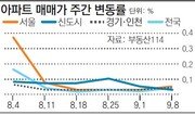 서울 아파트값 상승 폭이 7주 만에 다시 커졌다. 재건축 단지의 하락세가 멈춘 영향이 크다. 10일 부동산114에 따르면 지난주 서울 아파트 매매가는 0.05% 올라 전주(0.02%)보다 상승 폭이 커졌다. 4주 연속 하락하던 재건축 아파트가 지난주 제자리걸음(0.00%)을 했다. 서울시로부터 50층 재건축 계획 승인을 받은 송파구 잠실주공5단지를 중심으로 호가가 뛰었다. 서울 일반 아파트는 0.06% 올랐다. 구별로는 관악(0.19%) 광진(0.19%) 서대문(0.19%) 송파(0.14%) 강북구(0.14%) 등이 많이 올랐다. 강남구(―0.02%)는 내렸지만 전주(―0.10%)보다 하락폭이 줄었다. 수도권 신도시(0.03%)는 전주보다 매매가 상승 폭이 둔화됐다. 분당, 판교신도시가 각각 0.03%, 0.05% 올랐다. 전세시장은 9월 이사철이 시작됐지만 대체로 한산한 분위기다. 서울 아파트 전세금은 전주와 마찬가지로 0.03% 올랐다. 경기는 0.01% 올랐고 신도시는 보합세를 나타냈다.강성휘 기자 yolo@donga.com}