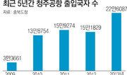 충북 청주국제공항의 연간 국제선 이용객 수가 1997년 개항한 이래 처음으로 20만 명을 돌파했다. 연간 전체 이용객 수도 7년 연속 100만 명을 넘어서면서 명실상부한 중부권 거점 공항으로의 면모를 갖추고 있다. 26일 충북도와 법무부 청주출입국관리사무소 등에 따르면 지난해 청주공항 국제선 이용객은 모두 22만6087명으로 집계됐다. 이는 2012년의 15만1829명보다 49%나 증가한 것. 개항 이후 가장 많은 국제선 이용객 수를 기록했던 2011년 15만9274명도 훌쩍 넘어선 수치다. 이처럼 청주공항의 국제선 이용객 수가 크게 늘어난 것은 충북도의 적극적인 중국인 관광객 유치 노력 덕분에 외국인 입국자가 늘어났기 때문이다. 지난해 외국인 입국자 수는 7만1137명으로 2012년의 3만7591명보다 87.4% 증가했다. 전체 출입국자의 외국인 비율도 61.6%(13만9258명)로 늘었다. 지난해 10월 중국의 여유법(旅遊法) 개정으로 잠시 중국인 단체관광객 수가 주춤하기도 했지만 12월부터는 2012년 수준으로 회복됐다. 여유법은 중국 정부가 지난해 4월 25일 만들어 10월 1일부터 시행한 것으로 여행사의 불합리한 저가 모객 금지 △쇼핑이나 별도 항목을 통한 수수료 징수 금지 △서비스료 요구 행위 금지 등이 주요 내용. 청주출입국관리소 관계자는 “국선 정기화와 다변화가 이뤄지면 이용객은 지속적으로 늘어날 것”이라며 “출입국자 수 증가에 따라 이에 따른 전담부서 설치와 인력 증원이 필요하다”고 밝혔다. 국제선 이용객 수가 늘면서 전체 이용객 수도 역대 최다를 기록했다. 지난해 청주공항 누적 이용객 수는 137만8604명으로 집계됐다. 이는 역대 최다를 기록했던 2011년의 133만7791명보다 4만813명 늘어난 것. 청주공항 이용객 수가 이처럼 늘어난 것에 힘입어 충북도와 한국공항공사는 올해 대대적인 투자에 나섰다. 도는 올해 국비 53억2000만 원을 들여 북측 진입도로 개설 △위험 활주로 개량 △비상용 통합접근 관제센터 구축 △천안∼청주공항 복선전철 연장 기본계획 수립 용역 등을 추진한다. 9월에 준공할 예정인 북측 진입도로는 지방도 540호선과 청주공항을 연결하는 도로. 북부권 이용객들의 불편을 줄이고 공항 순환교통망이 구축돼 접근성이 강화될 것으로 예상된다. 위험 활주로 개량은 현재 2744m인 활주로를 3200m로 늘리는 것으로, 공항의 안전성 강화와 국제노선 다변화, 대형 화물기 취항 등이 기대된다. 한국공항공사는 68억6000만 원을 투입해 여객청사를 리모델링해 공항 이용객의 편의를 꾀할 계획이다. 임택수 충북도 관광항공과장은 “이용객 편의와 접근성 강화 등을 위해 올해 대대적인 투자에 나섰다”며 “청주공항이 세종시 관문 공항과 중부권 거점 공항으로 우뚝 설 수 있도록 지속적인 공항 활성화 정책을 추진할 계획”이라고 말했다. 1997년 4월 개항한 청주국제공항은 당시만 해도 연간 이용객이 30만 명에 불과했다. 하지만 2007년부터 지난해까지 7년 연속 100만 명을 돌파할 정도로 성장했다. 총면적 674만 m²로 인천국제공항을 포함한 전국 15개 공항 중 다섯 번째 수준. 연간 315만 명의 국내외 승객이 이용할 수 있는 2만2406m²의 여객청사와 연간 3만7500t의 화물 처리 능력을 보유한 화물터미널을 갖추고 있다. 대전에서 45분, 서울에서 1시간 10분이면 올 수 있고 전북권과 강원권에서도 1시간 반 정도면 접근이 가능하다. 여기에 안중∼삼척, 당진∼울진, 서천∼영덕 고속도로가 완공되면 전국 어디서나 2시간대 접근도 가능해진다. 충북 청원 KTX오송역과 연계된 호남고속철도와 청주∼천안 전철까지 조성되면 명실상부한 사통팔달의 중부권 거점 공항으로 자리매김할 것으로 기대된다.장기우 기자 straw825@donga.com}