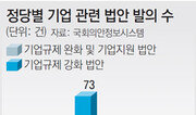 19대 국회가 개원한 뒤 3개월간 여야가 발의한 기업 관련 법률안 10건 중 8건은 기업 활동에 대한 규제를 강화하는 내용인 것으로 나타났다. 상당수는 12월 대선을 앞둔 여야 정치권이 경제민주화 이슈를 선점하기 위해 경쟁적으로 ‘기업 때리기’를 한 데 따른 결과다. 동아일보 취재팀이 12일 LG경제연구원, 한국금융투자협회, 전국경제인연합회 등의 도움을 받아 올 5월 30일 19대 국회가 개원한 뒤 지난달 말까지 발의된 1347개 법안을 분석한 결과 기업 활동에 영향을 주는 법안은 총 155건이었다. 이 가운데 현행 기업 관련 규제를 완화하거나 산업계를 지원하는 법안은 20%(31개)에 그쳤고 나머지 80%(124개)는 규제 강화에 초점이 맞춰진 것으로 분석됐다. 여야를 막론하고 규제를 완화하거나 기업을 지원하는 법률보다 규제를 강화하는 법률이 압도적으로 많았다. 41건의 규제 강화 법안을 낸 새누리당의 기업 지원 관련 법안은 17건에 그쳤다. 민주통합당도 전체 83건 중 73건(88%)이 기업 활동을 제약하는 법안이었다. 주요 규제 강화 법안으로는 순환출자 금지, 출자총액제한제도 등 기업의 지배구조와 관련한 법안이 8건 발의됐고, 대형마트의 영업시간을 제한하거나 의무휴일을 지정한 대형유통업체 관련 법안은 14건이었다. 근로자 정년을 늘리는 등 고용 및 노사관계 부문에서 기업의 부담을 늘리는 법안도 10건이 발의됐다. 반면 규제 완화 및 기업 지원 법안은 국내 금융투자업을 활성화하기 위한 ‘자본시장과 금융투자업에 관한 법률’, 리모델링 수직 증축을 허용하는 ‘주택법’ 등 일부에 불과했다. 전경련 규제개혁팀 유정주 차장은 “규제 완화에 해당하는 법안 31개 중 기업 활동에 도움이 되는 것으로 평가되는 법안은 자통법과 주택법 정도”라며 “나머지 법들은 경영에 도움이 거의 안 된다는 게 관련 업계의 평가”라고 지적했다. 좌승희 서울대 경제학부 겸임교수는 “각 정당이 정책의 일관성이 없이 대중에 영합하는 ‘좋은 말’만 하려다 보니 비슷비슷한 규제 법안을 양산하고 있다”며 “기업 활동을 규제하는 법안이 늘면 투자가 위축돼 일자리 감소 등 부작용이 생길 수밖에 없다”고 말했다.송충현 기자 balgun@donga.com 강유현 기자 yhkang@donga.com }