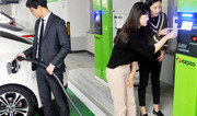 5일 롯데백화점 대구점 6층 주차장에서 고객들이 전기자동차 충전기를 이용하고 있다. 완전 충전은 1시간가량 걸리며 전용 카드로 충전하면 요금은 나중에 청구된다. 롯데백화점 대구점 제공}