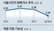 서울시가 7일 발표한 ‘2018 서울서베이(도시정책지표조사·survey)’ 결과에 따르면 서울시민은 이웃을 공공기관보다 신뢰하지 않고 계층 사다리가 무너졌다고 생각하는 것으로 나타났다. 2003년 시작한 서울서베이는 삶의 질, 주거, 경제, 복지 등에 대한 서울시민의 의식 변화와 사회상을 조사한다. 이번 서울서베이는 지난해 9월 서울시내 2만 가구(15세 이상 4만2991명)와 외국인 2500명을 면접 조사했다. 조사 결과 서울시민의 사회적 신뢰도는 가족이 10점 만점에 8.47점으로 가장 높았다. 이어 친구(7.08점), 공공기관(5.37점), 이웃(5.22점) 순이었다. 이웃에 대한 신뢰도가 공공기관보다 낮아진 건 이웃이 조사항목에 추가된 2011년 이후 처음이다. 윤상철 한신대 사회학과 교수는 “이웃에 대한 신뢰도 하락은 오래됐지만 점점 가속화하는 추세”라고 분석했다. 계층 사다리가 끊어졌다고 보는 응답자는 전년보다 늘었다. ‘노력하면 사회적 지위가 높아질 가능성이 있다’는 설문에 ‘가능성이 낮다’는 응답이 27.7%로 ‘높다’는 응답(24.0%)보다 3.7%포인트 높았다. 계층 이동이 어렵다고 보는 응답자가 계층 이동이 가능하다는 응답자보다 많아진 것은 역시 계층 이동 가능성을 조사하기 시작한 2011년 이래 최초다. 모든 연령대에서 계층 이동 전망이 나빠졌다. 10대(5.20점)와 20대(5.00점)는 전년 대비 각각 0.24점, 0.13점 하락했다. 윤 교수는 “젊은층에서 계층 이동 전망이 점점 낮아지는 것을 무겁게 여겨야 한다”며 “청년실업이나 저성장 등으로 젊은층이 더 이상 계층 이동이 어렵다고 인식한다면 이들의 더 큰 가능성을 막을 수 있다”고 강조했다. 서울시민의 행복지수는 6.90점으로 집계돼 2016년(6.97점) 이후 2년 연속 내리막이었다. 행복지수는 건강상태, 재정상태, 친구관계, 가정생활, 사회생활 등 5개 지표를 10점 척도로 측정해 평균값을 낸 것이다. 건강상태(7.22점)를 제외한 4개 항목 지수는 모두 전년보다 떨어졌다. 서울시민의 절반 이상(52.3%)은 조사에서 ‘최근 2주간 스트레스를 경험했다’고 답했다. 스트레스 정도를 10점 척도로 나타냈을 때 연령별로 보면 10대(6.33점)가 가장 높았고 60세 이상(5.53점)이 가장 낮았다. 소득별로는 월소득 400만∼500만 원에 해당하는 응답자가 6.05점으로 가장 많은 스트레스를 받는 것으로 나타났다. 서울시민 10명 중 6명(60.5%)은 직업이 있었다. 남성(76.2%)이 여성(45.7%)보다 취업비율이 높았다. 직장인은 하루 평균 8시간 26분을 일했고 출근에는 평균 34분을 썼다. 직업만족도는 10점 만점에 6.02점으로 ‘다소 만족한다’는 수준이었다. 가사(家事)에서는 양성평등으로의 길이 먼 것으로 나타났다. ‘집안일은 아내가 주로 책임지고 남편이 약간 돕는다’는 응답이 60.3%였다. ‘공평하게 나눠 하고 있다’는 응답은 15.7%였다.홍석호 기자 will@donga.com}