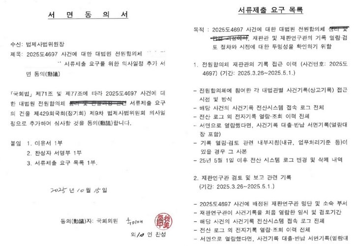 국민의힘 주진우 의원이 16일 국회 법제사법위원회 소속 여당 의원들이 대법원에 이재명 대통령 재판 관련 서류를 제출을 요구한 문서를 공개했다. 주 의원은 해당 문서에 이 대통령 이름을 포함한 사건명이 적히지 않았고, 일부 문구는 사인펜으로 황급히 지웠다고 지적하며 “북한에서나 나올 법한 장면”이라고 비판했다. 민주당이 이 대통령 재판과 관련해 대법원에 무리한 자료 제출을 요구하려 했다는 지적이다.주 의원은 이날 페이스북에 “어제 추미애 법사위원장과 (더불어)민주당 의원들이 대법원에 이재명 재판 관련 서류제출 요구를 했다”며 “재판과 사건에 관여할 의도”라고 올렸다. 그러면서 주 의원은 해당 내용을 담은 문서의 사진 4장을 올렸다.주 의원이 올린 문서는 ‘서면동의서’, ‘이유서’, ‘서류제출 요구 목록’ 등 3가지였다.서면동의서는, 추 의원장 외 10인이 찬성 동의자로 적혀 있었다. 제목에는 ‘2025도4697 사건에 대한 대법원 전원합의체 (중간 삭제) 서류제출 요구를 위한 의사일정 추가 서면 동의(動議)’라고 적혀 있었다. 이 문서의 본문 중 ‘심리 및 판결과정 관련’ 부분은 사인펜으로 추정되는 필기도구로 두 줄이 쭉쭉 그인채 삭제돼있었다.이유서에도 위 문서와 같은 문구의 부분이 같은 방식으로 삭제돼있었다. 서류제출 요구 목록 문서도 마찬가지였다.주 의원은 “(문서에서) 두 가지가 눈에 확 띈다”며 “2025도4697호 사건번호만 쓰고 사건명을 안 썼다. 사건명은 ‘이재명 공직선거법 위반 사건’”이라고 했다. 그는 “피자에도 이재명 이름을 막 갖다 붙이면서 서류제출 요구할 때는 이름을 왜 빼나? 부끄럽나”라고 물었다. 주 의원이 언급한 ‘피자’는 앞서 추석 연휴 기간에 방송된 JTBC ‘냉장고를 부탁해’에서 김풍 작가가 만든 ‘이재명 시래기 피자’를 언급한 것으로 보인다. 민주당이 이 대통령의 이름을 문서에서 일부러 뺐다는 주장으로 보인다.주 의원은 또 “문서에서 줄로 찍찍 ‘심리 및 판결과정 관련’이라는 말을 지웠다”며 “이재명 형사 사건의 ‘심리 및 판결과정’을 들여다보려는 속내가 드러나는 문구다. 황급히 지운 것”이라고 주장했다. 처음에는 심리 및 판결 과정 자료까지 요구하려다 ‘재판 개입’ 논란을 우려해 급하게 수정했다는 비판으로 풀이된다. 실제 문서에는 ‘심리 및 판결과정 관련’이라는 문구만 펜으로 줄을 그어 지운 흔적이 남아있다. 주 의원은 이를 두고 “북한에서나 나올 법한 장면”이라고 말했다. 조혜선 기자 hs87cho@donga.com}