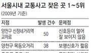 서울시내에서 교통사고가 가장 많이 발생한 곳은 양천구 신월동 신정네거리역 교차로인 것으로 집계됐다. 이는 서울시가 최근 2009년 한 해 동안 교통사고 다발구역 75곳을 분석한 결과다. 50건의 교통사고가 발생한 신정네거리역 교차로는 운전자 대기선과 신호등 간의 거리가 멀다는 점이 원인으로 지적됐다. 서울시 관계자는 “운전자들이 신호등을 보고 교차로가 더 멀리 있다고 착각해 속도를 늦게 늦추거나 꼬리 물기를 빈번하게 해 차량 추돌 및 접촉사고가 많았다”고 설명했다. 한 해 38건이 발생해 2위를 차지한 양천구 목동오거리의 경우 보행신호가 짧아 무단횡단 사고가 많은 것이 원인으로 나타났다. 3위인 종로구 종로1가 교차로(지하철 1호선 종각역 앞·37건 발생)도 역시 무단횡단 사고가 많았다. 인근 지역에 유흥가와 음식점이 많아 보행자가 많은 데다 횡단보도 간격이 먼 것이 원인으로 지적됐다. 시는 “사고가 많이 발생한 지역은 내년 말까지 신호등 수를 늘리거나 위치를 조정하고, 보행 잔여시간 표시기를 횡단보도에 설치하는 등 개선할 계획”이라며 “우선적으로 교통사고 발생 상위 75곳 중 개선이 시급한 35곳을 먼저 보강할 예정”이라고 밝혔다.이새샘 기자 iamsam@donga.com}
