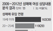 성매매 여성 10명 중 4명이 10대에 성매매를 시작한 것으로 나타났다.이는 서울시 다시함께상담센터가 2009∼2012년 센터에서 상담받은 성매매 여성 3869명 중 지속적으로 상담을 받은 413명을 분석한 결과다. 다시함께상담센터는 성매매 예방 및 성매매 여성 인권보호를 목적으로 2002년 설립됐다.센터에 따르면 413명 중 10대에 성매매를 시작한 여성이 163명(39%)으로 가장 많았다. 두 번째는 20∼25세로 119명(29%)이었다. 절반이 넘는 236명이 선불금을 지고 있었고, 이 중 1000만 원 이상을 빚으로 진 사람이 163명(69%)이나 됐다. 성매매 지역은 서울이 212명으로 가장 많았으며, 인천·경기(78명), 경상도(37명) 순이었다.센터 측은 “78명을 심층 인터뷰한 결과 가출 경험이 있다고 한 응답자가 58명(74%)이었다”며 “이 중 중학교 때 가출한 경우가 42명으로 가장 많았다”고 밝혔다. 또 가정폭력은 55%, 성폭력은 50%가 경험한 것으로 나타났다.특히 가정폭력을 경험한 성매매 여성 중 44%(38명)는 주 3회 이상 손이나 발로 폭행 당하거나 폭언을 듣는 등 복합적인 폭력에 시달린 것으로 조사됐다. 자살 시도를 한 적이 있다고 답한 사람도 64명에 달했다. 센터 측은 “성매매 여성 3명 중 1명은 청소년기에 학업 중단, 가출 등을 경험하며 성매매를 시작했고 가정폭력이나 성폭력에도 심각하게 노출돼 있었다”고 말했다. 상담을 원하는 피해 여성은 센터 홈페이지(www.dasi.or.kr)나 전화(02-814-3660)로 문의하면 된다.이새샘 기자 iamsam@donga.com}