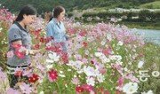 충북 괴산군 괴산읍을 가로지르는 동진천에 가을을 알리는 코스모스가 활짝 피었다. 괴산군은 2010년 6월부터 동진천 둔치의 콘크리트 포장을 걷어내고 산책로와 자전거 길을 만들었다. 또 이 일대 2km에 코스모스와 돼지감자꽃 길을 조성했다. 괴산군 제공}