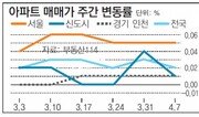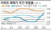 서울 재건축 아파트 상승세가 크게 꺾였다. 주택담보대출 금리 인상, 입주물량 증가, 조기대선 등이 겹치면서 관망세가 이어지기 때문인 것으로 보인다. 2일 부동산114에 따르면 3월 마지막 주 서울 아파트값은 전주처럼 0.05% 올랐다. 전주 0.12% 뛰었던 재건축 아파트값은 지난주 0.04% 오르는 데 그쳤다. 일반 아파트는 실수요자의 거래가 꾸준히 이어지며 0.06% 상승했다. 지역별로는 구로(0.15%), 중(0.14%), 성동(0.11%), 종로(0.11%), 송파(0.10%), 서초구(0.08%) 순으로 많이 올랐다. 전주에 제자리걸음을 했던 신도시 아파트값은 서울 위례신도시에서 거래가 이뤄지면서 0.04% 올랐다. 전세 시장도 이사철임에도 전세 수요가 뜸하면서 안정세를 보였다. 서울의 전세금은 0.03% 올랐다. 용산(0.22%), 구로(0.14%), 동대문(0.13%), 종로(0.12%), 성동구(0.07%) 등 매물이 적은 지역 위주로 많이 올랐다. 신도시는 0.02%, 경기·인천은 보합세였다.강성휘 기자 yolo@donga.com}