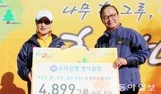 헐벗은 북한 땅을 푸르게 만들기 위한 ‘나무 한 그루, 푸른 한반도 희망 나눔 트레킹 및 식수 행사’가 17일 오후 강원 평창군 대관령면 횡계리 산림청 산간양묘장에서 열렸다. 아시아녹화기구와 우리은행이 주최하고 동부지방산림청이 주관한 이날 행사에는 우리은행 명예지점장 출신들로 구성된 ‘우리은행 명사클럽’ 회원 300명을 포함해 400여 명이 참가했다. 참가자들은 양묘장 인근 ‘국민의 숲길’ 3.5km 구간에서 트레킹을 한 뒤 북한에 보낼 묘목 37그루를 심었다. 나무들은 북한과 기후대가 비슷한 이곳에서 1, 2년만 지나면 언제든지 북한 땅에 옮겨 심을 수 있을 정도로 튼튼해진다. 이미 양묘장에는 5만7000그루의 묘목이 자라고 있다. 이날 우리은행은 북한에 보낼 4899그루의 묘목을 아시아녹화기구에 기탁했다. 4899는 특별한 의미가 담긴 숫자. 명사클럽 회원 참가자 300명에 클럽 창립 10주년을 기념하는 10을 곱해 3000을 만들고, 여기에 우리은행 창립연도인 1899년을 더했다. 강옥선 우리은행 명사클럽 총회장은 “10년 전 백두산에 갔을 때 헐벗은 북한 땅을 보고 가슴이 아팠다”며 “북한에 나무를 보내기 위한 의미 있는 행사에 참가하게 돼 기쁘다”고 말했다. ○ ‘나무 한 그루, 푸른 한반도’ 캠페인에 참여하려면?ARS 060-707-1700으로 전화(통화당 3000원 기부)하거나 계좌 이체(우리은행 1005-202-451214·예금주 기후변화센터 아시아녹화기구)를 하면 된다. 문의 아시아녹화기구 홈페이지(아시아녹화기구.org) 평창=이인모 기자 imlee@donga.com}