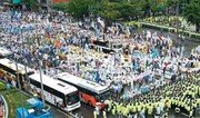 서울의 심장부 세종로가 2년 만에 다시 시위대에 점거당했다. 전국농민회총연맹(전농)과 한국대학생연합(한대련), 전국민주노동조합총연맹(민주노총), 전국노점상총연합회(전노련) 등 시위 참가자 6000명(경찰 추산·주최측 추산 2만 명)이 29일 오후 도심 곳곳에서 집회를 벌이다 기습적으로 세종로 사거리에 집결해 2시간 가량 시위를 벌였다. 시위대가 서울 세종로를 점거한 채 경찰과 대치한 것은 2009년 6월 10일 노무현 전 대통령 서거 추모집회 및 6월 항쟁 계승·민주회복을 위한 범국민대회 이후 2년 만이다. 경찰은 시위대가 도심 행진을 강행할 것을 예상할 수 있었는데도 안이하게 대처해 결과적으로 불법 시위를 방치했다는 지적을 받고 있다. 이날 기습 시위는 서울 도심에서 각각 집회를 개최한 단체들이 세종로 사거리 일대로 집결하면서 발생했다. 전농 소속 농민과 대학생 2000여 명은 이날 오후 1시 서울역 광장에서 전국농민대회를 열고 무관세 수입 중단과 구제역 도살처분 보상금 지급, 한미 자유무역협정(FTA) 비준 중단 등을 요구했다. ▼ ‘서울광장 집회’ 약속 깨고 기습 진입… 12개 차로 2시간동안 무법지대로 ▼같은 시간 전노련을 비롯한 빈민 단체 소속 1000여 명도 서울 보신각 앞에서 ‘빈민생존권 쟁취 결의대회’를 열고 노점 탄압 중단과 강제 퇴거·살인 개발 중단, 국민기초생활보장법 전면 개정 등을 촉구했다. 민주노총 소속 노동자 3000여 명은 오후 2시부터 서울광장에서 최저임금 쟁취와 노동조합 및 노동관계조정법 재개정을 요구하는 전국노동자대회를 열었다. 이들은 당초 각자 집회를 마치고 오후 3시경 서울광장에 집결해 한 시간 반 동안 이명박 정권을 규탄하는 범국민대회를 열고 이후 남대문과 을지로, 청계천을 따라 도로행진을 할 계획이었다. 경찰은 전농과 전노련에 서울광장까지의 거리행진은 허락했지만 범국민대회 이후의 행진은 불허했다. 하지만 허가받은 것과는 달리 서울역을 출발한 학생과 농민들은 서울광장에 도착하자마자 곧바로 세종로 방향으로 행진을 시작했다. 서울광장에서 집회를 마치고 기다리던 민주노총 노동자 3000명도 대열에 합류했고, 보신각에서 출발한 전노련도 곧장 세종로로 이동했다. 허를 찔린 경찰은 세종로 양방향 12개 차로를 점거한 시위대를 막기 위해 100개 중대 9000여 명의 경력과 방패차를 긴급 출동시켜 광화문광장 이순신동상 앞에 차벽을 세우고 살수차 10여 대를 배치했다. 경찰청 관계자는 “시위대가 진로를 바꿔 바로 세종로로 진입할 가능성을 미처 예상하지 못했다”며 “집회를 배려해 서울광장 집회도 허가했는데 결국 뒤통수를 맞은 셈”이라고 말했다. 이후 오후 6시 반까지 시위대는 경찰 진압을 피해 세종로와 종로, 을지로 일대를 몰려다니며 게릴라 시위를 계속했다. 이날 시위에서는 큰 물리적 충돌은 없었지만 세종로와 종로, 시청 앞 등 이 일대 교통이 극심한 혼잡을 빚었다. 한편 한대련 등 시위대 1500명은 오후 7시부터 오후 10시까지 청계광장에 모여 반값 등록금 실현을 요구하는 촛불집회를 개최했다.김지현 기자 jhk85@donga.com 박훈상 기자 tigermask@donga.com }