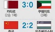 아시안컵 첫 8강 진출국이 나왔다. 주인공은 홈팀 카타르와 우즈베키스탄. 우즈베키스탄은 17일 카타르 도하 알가라파 경기장에서 열린 A조 3차전 중국과의 경기에서 2-2로 비겼다. 카타르와 쿠웨이트를 꺾은 우즈베키스탄은 2승 1무(승점 7점)로 조 1위를 기록해 8강에 올랐다. 개최국 카타르도 쿠웨이트를 3-0으로 완파하며 2승 1패(승점 6점), 조 2위로 8강에 합류했다. 반면에 중국은 우즈베키스탄과 비겨 1승 1무 1패(승점 4점)로 조 3위가 돼 탈락했다. 이날 무조건 우즈베키스탄을 이겨야만 8강에 진출할 수 있었던 중국은 총력전으로 나섰지만 지난 대회에 이어 두 대회 연속 조별리그 탈락의 수모를 당했다. 쿠웨이트도 3전 전패로 고개를 숙였다.김동욱 기자 creating@donga.com▶B조 일본-사우디아라비아, 요르단-시리아 경기 결과는 dongA.com 참조}