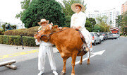 12일 오전 강원 춘천시 중앙로 4차로 도로에 사람을 태운 소 한 마리가 유유히 걷고 있었다. 이 소는 근화동 캠프페이지 옛 터를 출발해 강원도청까지 약 1km를 걸었다. 이날 흰 광목으로 만든 옷을 입고 쇠등에 올라탄 이는 김영교 평창영월정선축협 조합장(56). 김 조합장은 25∼28일 평창군 대관령면 하늘목장에서 열리는 ‘2014 대관령 한우축제’를 홍보하기 위해 이 이벤트를 마련했다. 소를 타고 이동하는 동안 춘천시민들에게 한우축제 일정을 소개하고 방문해 달라고 부탁했다. 그는 앞서 평창군 봉평면에서 열리고 있는 효석문화제에도 사흘 동안 소를 타고 나타나 관광객들에게 대관령 한우축제를 홍보했다. 그가 탄 소는 봉평면에 거주하는 조합원이 키우는 13년생 암소. 평소 사람이 올라타도 놀라거나 날뛰지 않을 정도로 유순하다. 김 조합장은 “광활하게 펼쳐진 초원에서 가족, 친구, 연인과 특별한 추억을 만들 수 있는 품격 있는 축제가 될 것”이라며 “축제의 성공은 지역 축산농가들에 큰 힘과 용기가 되는 만큼 많은 관광객이 찾아오기를 바란다”고 말했다. 올해 처음 열리는 대관령 한우축제는 40여 년 동안 일반인에게 개방하지 않았던 하늘목장(옛 한일목장)에서 열려 벌써부터 관심을 모으고 있다. 하늘목장은 한일시멘트 자회사인 우덕축산이 운영하는 곳으로 40년간 자연순응형 목장 형태로 남아 초원과 숲, 폭포 등 생태계가 잘 보존돼 있다. 대관령 한우축제에서는 ‘평창 쇠고기 올림픽 요리 경연대회’를 비롯해 전국 가족 그림 그리기 대회, 선자령 트레킹 대회 등이 열리고 양몰이쇼, 황병산 사냥놀이, 추억의 DJ박스 등의 다양한 볼거리, 즐길거리를 마련한다.이인모 기자 imlee@donga.com}