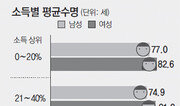 소득수준에 따른 수명 격차가 예상보다 크다는 사실이 확인됐다. 남성의 경우 소득수준 상위 20%가 하위 20%보다 9.1년이나 오래 살았다. 남성보다 평균적으로 오래 사는 여성도 고소득자의 수명이 저소득층에 비해 3.8년 길었다. 국민건강보험공단과 강영호 서울대 교수팀이 2002∼2010년 건강보험 가입자 1200만 명 중 연령 소득 질병에 대표성을 띠는 100만 명을 표본으로 삼아 분석한 결과다. 연구팀은 연간소득, 건물, 토지, 전월세금, 자동차 등 건보료 부과의 근거 자료를 이용해 소득을 파악한 뒤 0세를 기준으로 남은 수명(기대여명)을 비교했다. 연구 결과를 보면 건강보험 남성 가입자 중 소득 상위 20%의 기대여명은 77.0세로 평균(72.6세)보다 4.4년 더 길다. 상위 21∼40%(74.9세)도 평균보다 2.3년 오래 살았다. 반면에 하위 20%는 67.9세로 평균보다 4.7년이나 짧다. 차이는 남성보다 작지만 이런 경향은 여성도 마찬가지였다. 여성 소득 상위 20%의 기대여명은 82.6세로 평균(81.1세)보다 1.5년 길다. 하위 20%는 평균보다 2.3년 짧은 78.8세였다. 소득 상하위 계층 간 수명이 10년 가까이 차이난다는 점은 의료 격차의 심각성을 단적으로 보여준다. 남북한 평균수명 격차가 12세, 미국 흑인과 백인 간 수명 차가 4∼6세 정도임을 감안하면 건강 불평등이 얼마나 심한지 알 수 있다. 윤석준 고려대 의대 교수는 “중증질환 전 단계에서의 관리가 기대여명과 큰 연관이 있다. 저소득층은 돈을 아끼려고 병의원을 가급적 가지 않으려 해 병을 키우는 경향이 있다”고 지적했다. 이 같은 차이는 건강보험 가입 유형에 따라 비교해도 마찬가지였다. 남성은 직장가입자의 기대여명이 74.8세로 지역가입자(71.8세)보다 3.0년 길었다. 직장가입자가 안정적인 급여를 받는 반면에 지역가입자에는 농어민 자영업자 등 벌이가 불안정한 여러 계층이 섞인 점이 영향을 끼친 것으로 분석됐다. 문제는 빈곤층에 해당하는 남성 의료급여 수급자의 기대여명(55.0세)이 직장가입자보다 19.8년이나 짧다는 점이다. 여성 의료급여 수급자(71.6세)와 직장가입자(82.2세)의 격차도 10.6년이었다. 국내 의료급여 수급자의 기대여명은 북한의 2011년 기준 평균수명(남 65.1세, 여 71.9세)보다 낮은 것으로 나타났다. 의료급여 수급자의 낮은 수명은 비급여 항목을 이용하지 못한 결과임을 간접적으로 보여준다. 건강보험이 적용되지 않지만 의료서비스 수준이 높은 비급여는 의료비 격차의 주요 원인이다. 수급자들은 국가가 건보료를 지원해 비급여 항목을 제외하면 건보 가입자와 동일한 혜택을 누린다. 이번 연구에서는 남성(72.6세)과 여성(81.1세)의 평균 기대여명이 8.5년까지 벌어진 것으로 조사됐다. 연구팀은 한국 남성이 아직 생계를 책임지는 비율이 높다는 것이 결과에 영향을 끼쳤다고 분석했다. 스트레스를 흡연과 음주를 통해 해소하는 점이 문제점으로 지적됐다. 연구 책임자인 강영호 교수는 “이번 연구는 성별보다 소득, 재산 등 사회경제적 차이가 기대여명에 더 큰 영향을 끼친다는 사실을 보여줬다”며 “의료격차(건강 불평등)를 줄일 정부의 조치가 필요하다”고 지적했다.유근형 기자 noel@donga.com}
