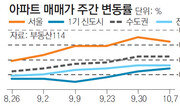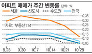 재건축 시장이 정부 규제 예고로 얼어붙으면서 서울 아파트값 오름세도 크게 꺾였다. 30일 부동산114에 따르면 10월 마지막 주 서울 아파트값 상승률은 전주(0.24%)의 절반에 불과한 0.12%로 나타났다. 서울 재건축 아파트값 상승률은 제자리걸음을 했다. 특히 재건축 시장을 이끌던 강남과 송파구 재건축 아파트값은 지난주 각각 0.02%, 0.03%가 떨어졌다. 지역별 아파트값은 강북(0.48%), 노원(0.32%), 은평(0.31%), 구로(0.28%), 도봉(0.27%), 강동(0.21%), 동작구(0.21%) 순으로 많이 올랐다. 재건축이 아닌 일반 아파트가 많은 이른바 ‘비(非)강남권’이 전주에 이어 가격 상승세를 이끌었다. 지난주 서울의 전세금은 0.07% 올라 상승폭이 전주(0.15%)의 절반 수준으로 줄어들었다. 가을철 이사 수요가 여전히 많지만 최근 새 아파트 입주물량이 늘어난 데다 재건축 단지에서 값싼 매물이 나왔기 때문으로 풀이된다. 지역별로는 강북(0.52%), 중(0.40%), 은평(0.32%), 구로(0.24%), 서대문(0.24%), 노원(0.20%), 양천구(0.15%) 순으로 많이 올랐다.강성휘 기자 yolo@donga.com}