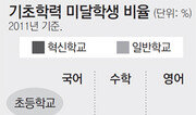 “학교가 미쳐가고 있습니다. 혁신학교로 지정됐다고 시험은 4과목만 칩니다. 4명씩 짝 지어서 학습지 한 장 주고 토론하라고 하니, 하루 종일 수다 떨다 온다네요.…공교육 시켜 달라고 보냈더니 뭐하는 건지…학교 수업을 가정에서 하게 생겼습니다. 공교육의 꽃은 선생님들의 질 좋은 수업 아닌가요.” 경기도교육청 홈페이지에 7일 올라온 글이다. 혁신학교 A중에 자녀를 보내는 학부모가 썼다. 혁신학교는 김상곤 경기도교육감이 2009년 처음 만들었다. 이듬해에는 좌파 성향 교육감이 당선된 서울 광주 강원 전북 전남 지역으로 확산됐다. 지난해 181개교에서 올해는 354개교(6월 기준)로 늘어났다. 민주통합당 문재인 대선후보는 8일 “혁신교육지원법을 제정해 혁신학교를 전국적으로 확장하겠다”고 밝혔다. 혁신학교의 상당수는 중간고사를 안 본다. 시험을 치르는 학교도 시험 과목은 일반학교에 비해 크게 적다. 학생들의 학습 부담을 줄여주자는 취지다. 혁신학교는 이렇게 교육과정을 자율적으로 운영할 수 있다. 또 교육청으로부터 해마다 평균 1억800만 원씩을 지원받는다. 서울의 혁신학교 B고에 다니는 C 양은 “학기 초에 국어 선생님이 시험은 안 보고, 자기소개서와 노트 정리, 발표, 논술을 성적에 반영하겠다고 해서 당황스러웠다. 그냥 공부만 하는 일반학교 학생들이 부러울 때가 많다”고 말했다. 자녀를 서울의 혁신학교인 D초등학교에 보낸 학부모는 “혁신학교로 바뀐 뒤 기말고사만 보는데, 100% 서술형이라 학생들이 아예 손도 못 대는 경우도 있다”며 “큰아이는 그나마 고학년이라 괜찮은데, 내년에 입학하는 작은아이는 걱정된다”고 말했다. 일반학교와 다른 수업 방식에 적응하지 못하는 학생도 있다. 혁신학교 E중의 F 군은 “수업 시간에 모둠끼리 토론한 결과를 제출하면 다음 시간에 선생님이 틀린 점을 가르쳐주는 방식으로 바뀌었다. 확실한 답을 알려주는 게 아니어서 수업 내용을 이해하기가 너무 힘들다”고 토로했다. 학생들의 불만이 엄살이 아니라는 지표도 있다. 지난해 국가수준 학업성취도평가 결과를 보면 혁신학교 181곳의 기초학력 미달 학생 비율은 일반학교보다 높았다. 국회 교육과학기술위원회 소속 강은희 의원(새누리당)이 교육과학기술부로부터 제출받은 자료에 따르면, 기초학력 미달 학생 비율이 혁신학교는 국어 2.6%, 수학 5.1%, 영어 3.1%였다. 일반학교는 각각 1.9%, 4.4%, 2.9%였다. 강 의원은 “혁신학교의 88%가 초중학교임을 감안할 때 기초학력 미달 비율이 높은 점은 문제다”며 “이 상태로 혁신학교를 유지할 필요가 있는지 고민해봐야 한다. 학생들이 교육감의 실험 대상이 돼서는 안 된다”고 말했다. 이에 대해 서울시교육청 학교혁신과 관계자는 “줄 세우기식 교육에 익숙해서 그렇지, 전체 학생은 큰 불만이 없다”고 반박했다. 경기도교육청 학교혁신과 관계자도 “혁신학교가 열악한 환경의 소규모학교 위주로 지정되다 보니 기초학력 미달 비율이 높을 수 있다. 하지만 그 비율이 점점 줄어드는 것으로 안다”고 주장했다. 한편 학교알리미에 따르면 혁신학교의 전국교직원노동조합 교사 비율은 지난해 24.4%로 전국 평균(12.3%)보다 2배가량 높았다. 특히 전체 교원 중 전교조 교사 비율이 절반 이상인 혁신학교는 24곳이었다.최예나 기자 yena@donga.com}