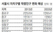 2013년 7월 서울시 자치구 중 인구가 가장 많은 곳은 송파, 노원, 강서, 강남, 관악구 순이었다. 하지만 이 순위는 2033년이면 송파, 강동, 강남, 노원, 은평구로 바뀔 것으로 서울시는 내다봤다. 서울시가 16일 발표한 ‘2013∼2033년 자치구별 장래인구 추계’에 따르면 서울 25개 자치구 중 20년 뒤 인구가 증가하는 곳은 강동, 서초, 은평구 세 곳뿐이었다. 서울시 전체 인구는 2013년 992만6000명에서 지속적으로 감소해 20년 뒤면 946만 명이 될 것으로 보인다. 서울시는 자치구별 출산율과 사망률, 전출입 추세, 거주민의 연령 등을 감안해 이 같은 예측 결과를 내놨다. 전출 인구에서 전입 인구를 뺀 ‘순이동’이 많고, 비교적 젊은 세대가 많이 사는 곳일수록 인구 손실이 적을 것으로 예상됐다. 인구가 2013년 46만 명에서 2033년 53만여 명으로 15% 이상 늘어날 것으로 예측된 강동구는 주변 경기 지역에서 인구 유입이 많고, 출산율도 다른 자치구에 비해 상대적으로 높다. 최근 순이동이 많아진 서초구, 은평구는 같은 기간 인구가 각각 12.4%, 3.6% 증가할 것으로 전망됐다. 이에 따라 학생이 많은 지역의 순위도 바뀔 것으로 보인다. 기존에는 송파, 노원, 강남, 양천, 강서구 순으로 학령인구(6∼21세)가 많았지만 2033년에는 송파, 강남, 노원, 강동, 서초구 순이 된다. 인구가 늘어나는 강동, 서초구가 양천, 강서구의 자리를 대신할 것으로 보인다. 추계에 따르면 서울시의 자치구별 학령인구도 20년 동안 30% 가까이 줄어들 것으로 전망된다. 강동구(16.5%) 서초구(5.5%) 강남구(1.9%)에서 초등학생이 소폭 증가하는 것을 제외하면 모든 자치구에서 학생은 줄어들 것으로 예상됐다. 가장 많이 줄어들 것으로 보이는 자치구는 금천구(―42.2%) 동대문구(―41.2%) 중구(―38.4%) 순이다. 일본의 ‘잃어버린 10년’을 예견한 경제학자 해리 덴트는 2018년 한국의 소비가 정점에 이르고 이후 인구절벽에 떨어져 장기 불황을 겪을 것이라고 예언했다. 그는 개인의 소비가 47세를 전후해 가장 높아진다고 보고, 한국에서 출산율이 정점을 찍었던 1971년에 태어난 이들이 40대 후반이 되는 2018년을 위기로 예측했다. 추계에 따르면 서울시의 40대 후반 인구도 2018년까지는 81만6609명으로 증가하지만 이후 꾸준히 하락해 2033년에는 61만6694명이 될 것으로 예상됐다. 2026년에는 서울시가 65세 이상 고령인구의 비율이 20%를 넘는 ‘초고령사회’로 진입하고, 2032년에는 서울시의 모든 자치구가 초고령사회가 될 것으로 예상됐다. 이에 따라 생산가능인구 100명당 부양해야 할 인구수가 2013년 30.9명에서 2033년에는 57.2명으로 증가한다. 서울시는 이 밖에도 자치구별 중위연령, 부양비 등을 측정한 자료를 ‘서울 통계’ 홈페이지(stat.seoul.go.kr)에 공개했다. 김기병 서울시 통계데이터담당관은 “이번에 처음 추계한 자치구 전망치를 어르신·청소년정책은 물론이고 서울시 주요 중장기계획의 효과적인 수립에 활용할 것”이라고 말했다.김민 기자 kimmin@donga.com}