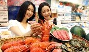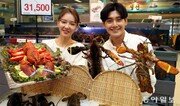서울 용산구 한강대로 이마트 용산점에서 모델들이 대형 활랍스터를 들어 보이고 있다. 이마트는 16일부터 나흘간 캐나다산 900g∼1kg짜리 활랍스터를 마리당 최저 3만1500원에 판매한다. 전체 물량은 1만 마리로 1인당 2마리까지만 구입 가능하다. 최혁중 기자 sajinman@donga.com}