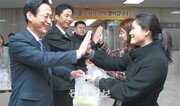 국민은행의 민병덕 은행장(왼쪽)이 10일 서울 영등포구 여의도 본점에서 출근하는 직원에게 ‘사랑의 도시락’을 전달하며 하이파이브를 하고 있다. 아침 도시락 전달 행사는 영업력 향상을 위해 최선을 다하고 있는 직원들을 격려하자는 취지에서 노사가 함께 마련했다. 국민은행 제공}