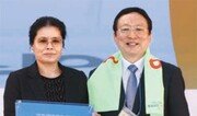 18일 오후 서울 송파구 잠실종합운동장에서 열린 ‘범외식인결의대회’에서 남은 음식 제로 운동 10만 호점 청해진 점주 이연희 씨(왼쪽)에게 남상만 한국음식업중앙회장이 기념명패를 전달했다. 양회성 기자 yohan@donga.com}