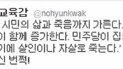 곽노현 서울시교육감(사진)이 19대 총선일인 11일 “미국에서는 보수가 집권하면 살인과 자살이 함께 증가한다”는 글을 트위터에 올린 데 대한 비판이 잇따르고 있다.곽 교육감은 이날 오전 자신이 투표장을 찾은 사진을 트위터에 올렸다. 이어 오후 3시 반경 “‘투표란 게 많은 시민의 삶과 죽음까지 가른다. 미국에선 보수가 집권하면 살인과 자살이 함께 증가한다. 민주당이 집권하면 죽지 않을 사람들이 공화당 집권기에 살인이나 자살로 죽는다.’ 하지현 교수의 4.9. 교총신문 기고문에 정신 번쩍!”이라는 글을 올렸다.하지현 건국대 교수가 정신과 의사 제임스 길리건의 저서 ‘왜 어떤 정치인은 다른 정치인보다 해로운가’의 내용을 언급한 9일자 한국교육신문 기고문을 투표 참여와 연결한 것. 하 교수는 기고문에서 미국에서 공화당이 집권하면 자살과 살인이 늘어난다는 책 내용을 바탕으로 투표 참여가 인간의 중요한 행복 추구권이라고 강조했다.하지만 정치적으로 중립을 지켜야 할 교육감이 투표가 진행 중인 상황에서 이 같은 글을 올린 게 부적절한 것 아니냐는 비판이 이어지고 있다. 트위터 아이디 ‘david********’는 “학생들에게 ‘보수는 악이고 진보는 선’이라는 식의 이분법적 교육을 하려고 하니 도대체 학생들이 앞으로 어떻게 자라날지 걱정”이라는 댓글을 달았다. 이와 관련해 시교육청 관계자는 “글을 읽고 인상적인 부분이 있어 투표를 독려하는 차원에서 올린 것으로 안다”고 설명했다.김도형 기자 dodo@donga.com}