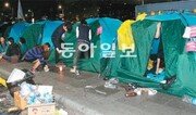 30일 오전 1시 서울 종로구 청계광장. 인적이 끊긴 도심에서 갑자기 민중가요가 울려 퍼졌다. 전날 오후부터 이 광장에서 반값 등록금 집회를 벌여 온 대학생 100여 명이 갑자기 앰프를 켜고 음악을 튼 것. 경찰이 순간 측정한 최대 소음지수는 89dB. 보통 공사장에서 사용하는 굴착기 소리가 90dB 정도다. 소음진동규제법상 야간에 허용되는 최대 소음지수는 70dB이다. “소음 허용지수를 넘어섰다”는 경찰의 경고방송에도 학생들은 공연을 강행했다. 오전 1시 50분경 ‘시끄러우니 볼륨을 줄이자’는 자성의 목소리도 나왔지만 공연은 30분 동안 더 진행됐다. 공연이 끝나고도 학생들은 광장에서 춤을 추며 큰 소리로 노래를 불렀다. 인근 도보에서는 소주병이 오가는 술판도 벌어졌다. 전날 집회에 참여한 학생 2500여 명 중 일부가 서울 한복판의 광장을 ‘도심 MT장’으로 만든 것이다.○ 밤새 이어진 ‘놀자판’ 시위한국대학생연합(한대련)은 반값 등록금 도입과 대학교육 문제 해결을 촉구하는 대학생 총회와 촛불집회를 지난달 29일 오후 7시 20분부터 진행했다. 수도권 대학생과 시민 2500여 명(경찰 추산·주최 측 추산 3000여 명)이 참가한 가운데 등록금 인하를 한목소리로 요구했다. 등록금 문제와 관련한 대학생들의 요구안 선언과 퍼포먼스, 기성 세대와 함께 벌이는 ‘토크 콘서트’ 등의 순서로 진행되던 집회는 오후 10시 20분경 별 충돌 없이 무사히 끝났다. 하지만 행사가 종료되자마자 집회 참가자 중 700여 명이 도로로 뛰어나왔다. 지하철 2호선 을지로입구역 사거리까지 거리행진을 강행한 이들은 왕복 8차로를 순식간에 점거했다. 경찰은 78개 중대 6000여 명을 배치하고 청계광장 주위를 차벽으로 둘러싸고도 도로 점거를 막지 못해 명동과 광화문 등 도심 일대에서 시위대와 격한 충돌을 벌였고 도심 교통은 두 시간 넘게 마비됐다. 마지막까지 남은 집회 참가자들은 명동 롯데백화점 앞으로 이동해 왕복 8차로 일부를 점거하고 늦은 밤까지 농성을 이어갔다. 경찰은 이날 집회 참가자를 해산시키기 위해 물대포를 수차례 사용했다. 반값 등록금 관련 집회에서 물대포가 등장한 것은 이번이 처음이다. 경찰의 거듭된 해산명령에 불복한 대학생 49명은 결국 현장에서 연행돼 성북경찰서와 강북경찰서 유치장 등에서 밤을 보내고 30일 저녁까지 조사를 받았다.경찰과의 충돌 끝에 청계광장으로 돌아온 학생 300여 명은 광장에 남아 있던 다른 학생들과 합류해 밤새 ‘촛불 야간자율학습’ 행사를 이어갔다. 이들은 광장과 인근 보도에 텐트 30여 동을 설치했다. 일부는 텐트에서 잠을 청했지만 일부는 술을 마시며 공연을 이어갔다. 학생들은 오전 5시가 돼서야 텐트를 걷어냈다. 텐트와 쓰레기를 모두 치운 뒤에는 ‘2MB(이명박 대통령) OUT’ ‘등록금 반값 넘어 무상’이라고 적힌 플래카드를 들고 기념사진을 촬영한 뒤 철수했다.○ 피해는 시민 몫밤새 이어진 집회와 공연에 인근 상가와 호텔은 큰 불편을 겪었다. 청계광장 인근은 특히 외국인 관광객이 묵는 관광호텔이 많은 지역. 인근 K호텔 로비에는 새벽까지 ‘저게 대체 무슨 행사냐’고 묻는 외국인 투숙객의 항의 전화가 이어졌다. 24시간 문을 여는 인근 커피숍 관계자는 “시위에 참가한 학생들이 화장실에서 얼굴과 몸을 씻는 등 마음대로 행동해 다른 손님들이 불편을 겪었다”고 말했다. 집회를 지켜보던 한 시민은 “자신들의 요구사항을 알리기 위해서가 아니라 술 마시고 놀려고 집회를 하는 것 같다”며 “시끄럽고 불쾌하다”고 지적했다. 112신고센터로도 ‘도대체 무슨 일로 이렇게 시끄러운 것이냐’고 묻는 민원 전화가 폭주했다.사실상 유명무실한 소음 기준 때문에 새벽까지 스피커를 틀어놓고 공연을 하는 상황에서도 특별한 제재 조치는 없었다. 특히 밤 12시 이후부터는 집회가 아닌 문화제로 적용됐기 때문에 경찰 단속이 사실상 무의미했다. 경찰 관계자는 “집회가 아닌 문화제이다 보니 집회 시위에 관한법을 경찰이 직접 적용할 수가 없었다”며 “구나 피해를 당한 상가에서 소음 규정 위반으로 고소나 고발을 하면 벌금형이 내려질 수 있다”고 설명했다.목요일 저녁을 맞아 ‘특수(特需)’를 기대했던 택시 운전사들도 울상이었다. 한 콜택시 업체 관계자는 “청계광장 인근에서 콜택시를 요청하는 승객이 많았는데 시위대가 도로를 점거하는 바람에 들어가지 못하고 그냥 돌아 나온 택시가 많았다”고 전했다. 이날 도로에서 만난 한 택시운전사는 “을지로입구역 사거리가 모두 통제돼 길에서 두 시간을 허비했다”고 하소연했다.이새샘 기자 iamsam@donga.com 김지현 기자 jhk85@donga.com }