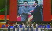 북한 조선중앙TV가 2일 방영한 모란봉악단의 신년 축하공연에 2000년 남북 정상회담 장면이 등장했다. 무대 뒤편의 대형 스크린에 2000년 6월 평양 순안 공항에서 당시 김대중 대통령과 김정일 국방위원장이 악수하는 자료사진이 보인다. 조선중앙TV 화면 캡처}