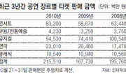 티켓 예매 사이트인 인터파크는 올해 공연 티켓 판매 현황을 분석한 결과 전체 매출액이 2155억 원으로 나타나 전년(1677억 원)보다 29% 상승했다고 22일 밝혔다. 장르별 상승률을 살펴보면 콘서트가 832억 원으로 전년보다 42% 성장해 성장률 1위를 기록했다. 무용 및 전통예술이 31% 증가한 42억 원을, 뮤지컬이 27% 오른 945억 원을, 연극이 13% 상승한 230억 원을 나타내며 뒤를 이었다. 반면 클래식은 105억 원에 그쳐 지난해보다 매출이 4% 하락했다.황인찬 기자 hic@donga.com}