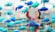 서울 도심에 천으로 만든 물고기가 떴다. 9일 서울 종로구 세종로 세종문화회관 세종예술아카데미 쉼터에서 열린 아트가든전 ‘물고기의 꿈’에 전시된 작품을 한 시민이 관람하고 있다. 전시는 10월 10일까지 계속된다. 장승윤 기자 tomato99@donga.com}