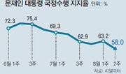 고공행진을 이어가던 문재인 대통령의 국정 지지율이 지난해 5월 취임 후 처음으로 50%대로 떨어졌다. 중도·보수층을 중심으로 지지율이 빠르게 하락하고 있는 가운데 국군기무사령부 계엄령 문건 수사 등 적폐 청산과 대국민 소통 행보에도 핵심 지지층인 진보층에서도 지지율이 꾸준히 떨어지는 현상이 나타나고 있는 것. 청와대는 은산분리 완화 등 규제혁신 드라이브를 통해 반등에 대한 기대를 내비치고 있다. 여론조사기관 리얼미터가 tbs 의뢰로 6∼8일 전국 성인 남녀 1507명을 대상으로 실시한 조사 결과에 따르면 문 대통령의 국정 수행에 대한 긍정 평가율은 전주(63.2%)보다 5.2%포인트 내린 58.0%로 나타났다. ‘국정 수행을 잘못하고 있다’는 부정 평가는 5.4%포인트 오른 35.8%였다. 리얼미터 조사에서 문 대통령 국정 지지율이 60% 밑으로 내려간 것은 이번이 처음이다. 국정 지지율은 올 1월 4주 차에 평창 겨울올림픽 여자 아이스하키 남북 단일팀 구성 논란과 가상화폐 대책 혼선으로 60.8%까지 내려갔지만 북한의 올림픽 참가로 반등해 남북 정상회담 직후인 5월 1주 차에는 지지율이 77.4%까지 오르기도 했다. 하지만 이후 최저임금 인상 논란과 함께 북-미 비핵화 협상이 교착상태에 빠지면서 줄곧 내리막길을 걷고 있는 상황이다. 이념 성향별로는 중도·보수층의 지지율 하락세가 뚜렷했다. 보수층 지지율이 전주보다 6.6%포인트 하락한 가운데 중도층의 국정수행 지지율 역시 6.8%포인트 떨어졌다. 외교적 성과를 바탕으로 대선 때는 문 대통령에게 표를 던지지 않았던 보수·중도층을 품었지만 최근 경제 지표 하락과 함께 찾아온 소득주도성장 논란 속에 이들이 등을 돌리고 있다는 것. 진보층의 지지율도 2.9%포인트 하락하면서 핵심 지지층의 이탈 조짐도 나오고 있는 상황이다. 지역별로는 PK(부산울산경남)이 전주보다 12.9%포인트 하락하는 등 보수성향이 강한 지역의 지지율 하락세가 뚜렷한 가운데 광주전라 지역에서도 지지율이 2.7%포인트 떨어졌다. 이날 청와대에서 열린 현안점검회의에서도 국정 지지율에 대한 보고가 이뤄졌다. 김의겸 청와대 대변인은 “요즘 쟁점이 되고 있는 문제들, BMW나 전기요금 등에 대해 우리 정부가 얼마나 민감하게 반응하고 있는지 스스로 돌아보는 시간이 있었다”고 말했다. 다만 이날 회의에선 은산분리 완화가 잘한 결정이라는 응답이 53.7%라는 여론조사 결과를 놓고 긍정적인 평가도 나왔던 것으로 전해졌다. 특히 청와대 일각에선 시민단체들의 반발에도 진보층의 긍정 평가가 66.6%로 부정 평가(16.2%)를 압도한 데 고무된 반응을 보인 것으로 알려졌다.문병기 기자 weappon@donga.com}