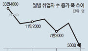 지난달 취업자 수가 5000명 증가하는 데 그치며 일자리 상황이 글로벌 금융위기 이후 최악의 수준으로 내몰렸다. 지난해 월평균 31만 명 수준이었던 취업자 증가가 최근 들어 10만 명 수준으로 급감한 데 이어 급기야 1만 명 밑으로 떨어진 것이다. 실업자 수는 7개월 연속 100만 명을 넘어서며 1997년 외환위기 이후 가장 사정이 나빴다. 제조업, 도소매업 등 업종을 가리지 않고 고용대란이 나타나고 있어 탈출구 없는 ‘고용 참사’ 우려가 더욱 커지고 있다. 17일 통계청이 내놓은 7월 고용 동향에 따르면 7월 취업자 수는 지난해 같은 달보다 5000명 늘어나는 데 그쳤다. 이는 2010년 1월(―1만 명) 이후 최저치다. 취업자 수는 한국 경제의 뼈대인 제조업에서 가장 많이 줄었다. 7월 제조업 취업자 수는 12만7000명이 줄어 올해 4월 이후 4개월 연속 감소 폭이 확대되고 있다. 자동차와 조선 구조조정이 영향을 미쳤다. 자영업자들이 몰려 있는 도소매, 숙박·음식점업에서는 취업자 수가 8만 명 감소해 지난해 12월 이후 8개월째 감소했다. 제조업과 도소매업종 등에서의 고용 부진은 40대에게 특히 큰 영향을 미쳤다. 40대는 취업자 수가 14만7000명이나 줄었다. 관련 통계를 확인할 수 있는 1996년 8월 이후 두 번째로 큰 규모다. 가장 많이 줄었던 때는 외환위기 여파가 한창이던 1998년 8월(―15만2000명)이었다. 통계청 관계자는 “40대가 주로 제조업, 도소매업에 포진해 있고, 임시일용직 비율도 높아 취업자 감소 폭이 컸다”고 설명했다. 7월 실업자 수는 103만9000명으로 올해 1월 이후 7개월 연속 100만 명대였다. 1998년 2월∼2000년 3월 26개월 연속 실업자 수가 100만 명을 넘어섰던 이후로 가장 긴 기간 실업자 수가 100만 명을 넘고 있는 것이다. 지난달 실업률은 3.7%로 작년 7월보다 0.3%포인트 높아졌다. 김동연 경제부총리 겸 기획재정부 장관은 이날 경제부처 장관들을 소집해 긴급경제현안간담회를 열고 고용쇼크 대응책을 논의했다. 이날 회의에서는 최저임금 인상의 영향이 일부 업종과 계층에 나타나고 있다고 진단을 내린 것으로 전해졌다. 문재인 대통령은 이날 고용지표에 대해 대통령정책실의 보고를 받고 신규 취업자 수가 당초 예상보다 크게 줄어든 원인을 파악하도록 지시한 것으로 알려졌다. 청와대 관계자는 “현재 (일자리) 상황은 당초 전망보다 하락 폭이 더 크다”며 “대책 마련 전에 원인부터 분석해야 하는 상황”이라고 말했다.세종=김준일 jikim@donga.com / 문병기 기자}