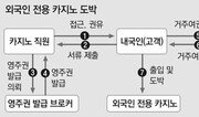 서울 광진구의 한 호텔에 입점해 있는 외국인 전용 카지노업체 P사의 박모 팀장(54)과 정모 차장(43)은 2008년 6월 강원랜드 카지노에서 근무한 경력이 있는 박모 씨(43)에게서 강원랜드 VIP 고객 명단을 입수했다. 박 팀장 등은 강원랜드 인근 은행 직원을 통해 VIP 고객의 연락처를 확보해 이 가운데 건설업체 대표 A 씨를 직접 만났다. 이들은 “남미 국가 영주권을 만들어 줄 테니 강원랜드까지 가지 말고 서울의 외국인 카지노에서 게임을 하라. 영주권 발급 비용은 우리가 대겠다”며 A 씨를 꾀었다. 볼리비아 파라과이 등 남미 국가의 영주권 관련 서류가 위조하기 쉽다는 점을 노린 것이었다. A 씨는 순순히 동의했다. 박 팀장 등은 심모 씨(41) 등 카지노에 고객을 소개하는 에이전트 2명에게 수익의 10∼15%를 주기로 약속하고 A 씨에게 볼리비아 영주권이 있는 것처럼 서류를 위조하도록 했다. A 씨는 이들에게서 받은 서류를 외교통상부에 내고 거주여권을 발급받았다. 거주여권이란 외국 영주권을 취득해 해외로 이주한 내국인에게 발급하는 여권으로 이 여권이 있으면 외국인 전용 카지노를 출입할 수 있다. A 씨는 카지노를 드나들며 330억 원을 걸고 ‘바카라’ 게임을 즐겼고, 모두 41억 원을 잃었다. 이후에도 박 팀장 등은 강원랜드 VIP 고객들에게 차례로 접근해 같은 방법으로 외국인 카지노에서 도박을 할 수 있도록 주선했다. 거주여권 발급이 어려우면 브로커를 통해 외국여권이나 거주여권을 위조해 만들어 주기도 했다.이 같은 불법 호객행위에 넘어간 내국인은 총 21명. 이 중에는 연예기획사 대표, 골프장 사장 같은 재력가뿐만 아니라 주부도 있었다. 이들은 적게는 수천만 원에서 많게는 수십억 원까지 총 170억여 원을 탕진했고 일부는 주민등록이 말소되거나 도박중독치료센터에서 치료를 받았다. 서울중앙지검 강력부(부장 김희준)는 내국인들을 해외이주자로 신분을 세탁해 외국인 전용 카지노에서 도박을 하도록 알선한 혐의(도박개장 등)로 박 팀장과 정 차장 등 2명을 구속기소했다고 14일 밝혔다. 또 외국 영주권 서류를 위조해 수수료를 받아 챙긴 혐의(공문서 위조 등)로 심 씨 등 카지노 에이전트 2명과 여권위조 브로커 3명을 구속기소하고 외국인 전용 카지노에서 도박을 한 내국인 21명을 상습도박 혐의로 불구속 기소했다. 검찰은 2007년까지 단 한 건도 없던 볼리비아 영주권자에 대한 거주여권 발급 건수가 2008년 13건, 지난해 130건으로 크게 늘어나는 등 일부 남미 국가 영주권자의 거주여권 발급 건수가 급증한 것에 주목해 외국인 전용 카지노에 드나든 내국인들이 더 있을 것으로 보고 수사를 확대하고 있다. 이 사건이 불거지자 문화체육관광부는 올해 8월 해외 영주권자가 외국인 전용 카지노에 출입할 때는 거주여권과 함께 재외국민등록부 등본을 제시하도록 지침을 바꿨다.유성열 기자 ryu@donga.com}
