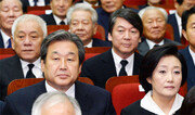 김대중 전 대통령의 5주기 추도식이 18일 서울 동작구 현충로 국립서울현충원에서 엄수됐다. 추도식엔 김 전 대통령 부인 이희호 여사 등 유가족과 정치권 인사들이 대거 참석했다. 여권에선 새누리당 김무성 대표, 조윤선 대통령정무수석비서관, 한광옥 국민대통합위원장, 새정치민주연합에선 박영선 국민공감혁신위원장 겸 원내대표, 김한길 안철수 전 공동대표, 김 전 대통령 가신그룹인 동교동계 권노갑 상임고문 등이 참석했다. 김, 안 두 전직 대표가 공식 석상에 모습을 보인 것은 7·30 재·보궐선거 참패로 대표직에서 물러난 뒤 처음이다. 세월호 유가족들도 자리를 함께했다. 새누리당 김 대표와 새정치연합 박 위원장은 나란히 자리에 앉았다. 그러나 간단한 인사만 한 채 대화를 나누지는 않았다. 추도식이 끝난 뒤 박 위원장은 “여야가 민주주의의 길, 정의로운 대한민국의 길이 무엇인지를 되새기는 하루였으면 좋겠다”고 말했다. 김 대표는 세월호 특별법 재협상 여부에 대해 “양보할 수 있는 여지가 있을 때 대표의 결단이 필요한 것”이라며 “현재는 우리가 양보할 수 있는 데까지 양보한 상황”이라고 말했다. 추도식장 입구엔 박근혜 대통령이 보낸 조화와 북측이 보내온 김정은 노동당 제1비서의 조화가 각각 왼쪽과 오른쪽에 놓였다. 김정은 조화 옆으로는 전두환 노태우 전 대통령의 조화가 놓였다. 새누리당 김진태 의원은 보도자료를 내고 “북한 김정은이 보낸 조화가 대한민국 호국의 성지인 국립현충원에 놓여 있다”며 “북한에 맞서 대한민국과 자유민주주의를 지키다 산화한 호국영령들이 벌떡 일어나 노여워할 일”이라고 밝혔다.한상준 기자 alwaysj@donga.com}