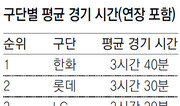 올 시즌 프로야구 평균 경기시간이 지난해보다 길어진 것으로 나타났다. 한국야구위원회(KBO)에 따르면 13일 현재 경기당 평균시간은 3시간 25분(연장 포함)으로 지난 시즌 3시간 21분보다 4분이 길어졌다. KBO는 국내 프로야구가 2014시즌 역대 가장 긴 평균 경기시간(3시간 27분)을 기록한 이후 지난해부터 이닝 중 투수 교체시간을 2분 45초에서 2분 30초로 줄이는 등 경기시간 단축에 공을 들이고 있다. 실제로 지난 시즌에는 6분 단축 효과를 봤다. 올 시즌 다시 경기시간이 늘어난 데에는 한화의 영향이 크다. 13일까지 한화는 평균 3시간 40분씩 경기를 치렀다. 10개 구단 중 가장 짧게 경기를 끝낸 SK(3시간 16분)에 비해 24분이 길다. 통상 1이닝이 20분 내외로 진행된다는 점을 감안했을 때 한화는 SK에 비해 경기당 1이닝씩을 더 치른 셈이다. 원인으로는 잦은 연장경기와 투수 교체 등이 꼽힌다. 한화는 13일까지 LG와 함께 가장 많은 연장경기(12번)를 치렀다. 올 시즌 한화는 가장 많은 평균 4.90명의 투수를 한 경기에 투입했다. 10개 구단의 전체 평균(4.39명)에 비해 2경기당 한 명꼴로 더 투수를 마운드에 올렸다. 한화에 이어 롯데(3시간 30분)와 LG(3시간 29분)가 경기시간이 길었다. 9일 사직구장에서 열린 두 팀의 맞대결에서는 올 시즌 가장 긴 5시간 33분 동안 경기를 했다. 롯데는 이달 들어 13일까지 거둔 전체 3승 중 선발승이 단 한 차례도 없을 정도로 경기 후반까지 엎치락뒤치락 경기를 펼쳤다. SK와 넥센(3시간 19분)은 평균 200분 안쪽에 경기를 끝냈다. 올 시즌 최단 경기 기록은 4월 17일 넥센과 KIA의 대결에서 나온 2시간 26분이었다. 강홍구 기자 windup@donga.com}