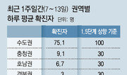 13일 서울과 인천, 경기 등 수도권에서는 신종 코로나바이러스 감염증(코로나19) 환자가 113명이 나왔다. 지난달 23일(121명) 이후 가장 많다. 5단계로 개편된 사회적 거리 두기가 시행된 7일 이후로 수도권에서 하루에 100명이 넘는 확진자가 발생한 것은 처음이다. 수도권의 경우 일주일 동안의 하루 평균 확진자가 100명 이상이면 거리 두기 1.5단계 상향 요건에 해당한다. 중앙재난안전대책본부(중대본)에 따르면 수도권에서 최근 일주일간(7∼13일) 하루 평균 확진자는 75.1명이다. 거리 두기 1.5단계 기준의 75%에 이른 것이다. 직전 일주일 동안의 하루 평균 확진자는 69.1명이었다. 서울과 인천, 경기는 아직 중대본과 거리 두기 단계 상향 조치를 위한 논의를 시작하지는 않았지만 자체적인 검토에 들어간 것으로 알려졌다. 수도권에서는 최근 서울 동대문구의 에이스희망케어센터와 강서구 일가족, 경기 군포시 의료기관, 안양시 요양시설 등 추가 감염자가 계속 발생하고 있는 집단 감염 사례가 잇따랐다. 방역당국은 산발적인 소규모 집단 감염은 감염원을 찾아내기가 쉽지 않은 데다 방역 조치의 범위도 넓어 특정 시설에서의 대규모 감염 못지않게 우려하고 있다. 수도권에서는 또 생활 속 거리 두기에 해당하는 1단계 시행 이후 시민들의 이동량이 조금씩 늘고 있다. 방역당국에 따르면 휴대전화 가입자 정보를 바탕으로 분석한 이동량에 따르면 수도권은 11월 첫 주말인 7일과 8일 3630만1000건으로 직전 주말에 비해 79만8000건(2.2%)이 증가했다. 수도권의 버스와 지하철, 택시 이용량도 2348만 건으로 같은 기간 4%가량 많아진 것으로 나타났다. 중대본은 코로나19 유행 조짐이 있는 전국의 시군구를 ‘방역지원지역’으로 정해 고위험 시설이나 집단에 대해 2주 간격의 진단검사 등 방역을 강화하기로 했다. 또 수능이나 연말연시처럼 감염 위험도가 높아지는 시기를 ‘특별 방역기간’으로 지정해 집합 금지나 시설 영업단축 등의 조치를 취할 수 있도록 할 예정이다.김상운 sukim@donga.com·김소민 기자}