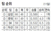 “못 쳐서 문제죠. 타선의 기복을 줄여야 하지 않겠어요.” 지난달 8일 이후 선두를 내준 적이 없는 삼성의 류중일 감독. 그에게도 걱정거리 하나가 있다. 바로 들쭉날쭉한 타격 컨디션. 삼성이 23일 현재 팀타율 1위(0.270)인 것을 감안하면 이해가 가지 않을 수도 있다. 하지만 류 감독의 생각은 단호하다. 그는 “8월 초와 같은 극심한 타격 슬럼프가 다시 온다면 한국시리즈 직행에 어려움이 생길 수 있다”고 경계했다. 류 감독의 노심초사하는 마음이 통해서였을까. 24일 잠실 LG전에 나선 삼성은 시즌 5번째 선발전원안타를 터뜨리며 류 감독의 마음을 가볍게 했다. 삼성은 장단 12안타를 터뜨리며 LG에 6-3, 7회 강우 콜드게임승을 거뒀다. 선두 삼성은 이날 패한 2위 SK를 4.5경기 차로 앞섰다. 특히 국민타자 이승엽의 팀 배팅이 빛났다. 이승엽은 1회 1사 2루에서 가볍게 밀어 치는 스윙으로 선제 1타점 적시타를 만들어냈다. 3-2로 쫓기던 4회 1사 2, 3루에서도 욕심을 버리고 정확한 타격으로 2타점 적시타를 터뜨렸다. 4타수 2안타 3타점. 이승엽은 “팀이 선두지만 아직 긴장을 늦출 때가 아니다. 남은 30경기 중 20승을 거둘 수 있도록 최선을 다하겠다”고 말했다. 삼성 선발 고든은 5이닝 동안 8안타를 허용했지만 3실점 호투를 펼치며 시즌 9승째(3패)를 챙겼다. 넥센은 목동에서 짜릿한 2-1 역전승을 거두며 SK의 8연승을 저지했다. 넥센은 1회 강정호의 적시타로 1-0으로 앞서갔지만 7회 SK 이호준에게 동점 솔로포를 허용했다. 그러나 넥센의 신인왕 후보 서건창은 1-1로 맞선 8회말 역전 2루타를 터뜨리며 승부에 마침표를 찍었다. 두산은 사직에서 0-0으로 맞선 9회초 최재훈의 결승 적시타에 힘입어 롯데를 1-0으로 꺾었다. 유근형 기자 noel@donga.com}
