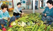 충북 괴산의 대표 명품 농특산물인 ‘대학찰옥수수’가 본격 출하됐다. 8일 괴산군에 따르면 칠성면 두천리에서 시설재배를 하는 정의영 씨가 5일 첫 출하를 하면서 전국의 소비자들을 찾아가기 시작했다. 올해 괴산군에서는 모두 2599농가에서 1400ha에 옥수수를 심어 168만 포대(포대당 30개 기준)를 생산해 201억6000만 원의 수익을 올릴 것으로 예상되고 있다. 이는 지난해 2278농가, 1574ha에서 188만9000포대를 생산했던 것보다 11%(174ha) 줄어든 것. 종자를 보급하는 미국 오클랜드 지역의 이상기온으로 종자 수입량이 지난해 3만7000봉지(봉지당 1kg)에서 1만6000봉지로 줄었고 파종기 가뭄까지 겹쳤기 때문이다. 노지출하는 20일부터 시작될 예정이다. 괴산군과 대학찰옥수수 작목반은 수확량이 줄었지만 소비자들이 부담없이 사먹을 수 있도록 지난해와 같은 1포대(30개, 약 7.5kg)당 1만5000원(택배비 별도)에 판매하기로 했다. 괴산군 장연면 방곡리에서 재배를 시작해 전국으로 퍼진 대학찰옥수수는 보통 15∼17줄인 일반 옥수수와 달리 8∼10줄로 알이 굵고 색이 희다. 차지고 고소한 맛에 껍질도 얇아 잇새에 끼거나 달라붙지 않는 게 특징. 방곡리가 고향인 최봉호 전 충남대 교수가 고향을 위해 1991년 개발한 신품종이다. 원래 품종명은 ‘장연 연농1호’지만 대학교수가 개발하고 종자를 보급해 ‘대학찰옥수수’라는 이름이 붙었다. 한국능률협회경영인증원으로부터 참살이(웰빙) 상품으로 선정됐고, 지난해 5월에는 국립농산물품질관리원의 지리적표시 ‘77호 괴산찰옥수수’로 등록됐다.장기우 기자 straw825@donga.com}