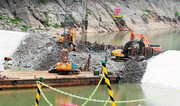 한국수자원공사 측이 이번 주 비 소식이 예정되자 2차 피해를 막기 위해 9일 충북 단양군 단성면 단양수중보 임시물막이의 물길을 트고 있다. 임시물막이는 5, 6일 집중호우로 일부가 유실돼 응급 복구를 해놓은 상태다. 연합뉴스}