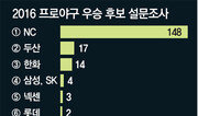 NC가 가장 두렵고 부러운 존재였다. 거꾸로 가장 만만한 건 넥센이었다. 올 1월 1일부터 프로야구 관련 매체들이 실시한 2016 프로야구 우승 후보 설문 조사를 분석한 결과다. 동아일보 야구팀이 기존 조사 결과를 연구하는 ‘메타 분석’ 기법을 프로야구 시즌 전망에 적용해 본 것이다.○ NC가 1강! 선수와 해설위원, 구단 프런트 직원 등으로 구성된 전체 설문 응답자(중복 포함) 193명 중 148명(76.7%)이 NC를 올 시즌 우승 후보로 꼽았다. 2위를 차지한 지난해 챔피언 두산(17표)과 비교해도 8.7배나 많은 수다. 반면 KIA와 kt를 우승 후보로 지목한 응답자는 한 명도 없었다. 지난해 정규시즌 2위를 차지한 NC는 자유계약선수(FA) 시장에서 박석민(31)을 영입하면서 타선에 화룡점정을 했다. NC는 지난해 844점을 올렸다. 넥센(904점)과 삼성(897점) 다음으로 많은 점수였다. 넥센은 박병호(30·미네소타), 유한준(35·kt) 등이 전력에서 이탈했고, 삼성은 박석민이 떠났다. 올 시즌 NC가 리그 최다 득점을 기록할 가능성이 높은 이유다. 여기에 투수진은 지난해와 큰 차이가 없다. 외국인 투수 해커(33)와 스튜어트(30)는 지난해 27승(7패)에 평균자책점 2.97을 합작했다. 지난해 6월 합류한 스튜어트가 개막 때부터 NC와 함께했다면 승수는 더 올라갔을 확률이 높다. 31세이브로 이 부문 2위를 차지한 마무리 투수 임창민(31)을 비롯한 불펜진도 탄탄하다. 지난해 NC 구원 투수들은 리그에서 가장 낮은 평균자책점 4.50을 기록했다. 김경문 NC 감독은 “남들이 우승 후보로 봐 주면 고마운 일이다. 우리가 아니라고 부정하는 것도 이상한 일”이라며 “내가 할 일은 선수들이 부담 갖지 않게 하는 것”이라고 말했다.○ 넥센 1약? 올 시즌 가장 유력한 꼴찌 후보로 꼽힌 건 넥센이다. 우승 후보와 마찬가지 방식으로 기존 설문 조사를 분석한 결과 넥센은 41표 중 21표(48.8%)를 받았다. 막내 구단 kt가 14표로 2위였고 LG가 4표, KIA가 3표를 받았다. 넥센은 박병호, 유한준이 떠난 빈자리만큼이나 투수력 공백도 우려되고 있다. 지난해에도 팀 평균자책점 5.49(7위)로 마운드가 약한 편이었다. 오프시즌에 투수력을 보강해도 모자랄 판에 전력 누수만 이어졌다. 외국인 에이스 밴헤켄(37·세이부)은 일본 프로야구로 떠났고 FA 자격을 얻은 마무리 투수 손승락(34)은 롯데 유니폼을 선택했다. 필승조 조상우(22)와 한현희(23) 모두 수술을 받아 올 시즌 경기에 나설 수 없다. 넥센 투수들에게 정신적 지주 노릇을 하던 송신영(39)도 2차 드래프트를 통해 한화로 건너갔다. 한 해설위원은 “넥센은 한꺼번에 전력이 너무 많이 빠졌다. 솔직히 나머지 9개 팀과 전력 차가 크게 날 것이다. 만약 넥센보다 못하는 팀이 있다면 그 팀은 정말 심각한 문제가 있는 것”이라고 깎아내렸다. 이에 대해 염경엽 넥센 감독은 “누가 어떤 말을 해도 꼴찌로 뽑히는 것은 감독으로서 싫다. 우리 팀에 공백이 생긴 부분을 밖에서는 부정적으로 보지만 나는 긍정적으로 보는 부분도 있다. 그 부분에서 차이가 날 수도 있다. 성적으로 보여 줄 것”이라고 다짐했다. 황규인 kini@donga.com·강홍구 기자 }