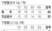 동부가 프로농구 사상 최초의 8할 승률을 완성했다. 동부는 1일 안양에서 열린 인삼공사와의 방문경기에서 64-55로 이겼다. 이로써 동부는 역대 시즌 최다승 기록을 44승(9패)으로 늘리며 승률 0.830을 기록해 4일 모비스와의 남은 한 경기 결과에 상관없이 8할이 넘는 승률로 정규시즌을 끝내게 됐다. 종전 한 시즌 최고 승률은 팀당 21경기의 약식 리그였던 프로농구 원년(1997년)에 기아가 세운 0.762(16승 5패)다. 당시 기아에서 뛰며 최우수선수에 뽑혔던 강동희 동부 감독은 현역 시절 세웠던 기록을 지도자로 깨뜨리며 최고 시즌의 한 페이지를 장식했다. 동부의 대기록은 쉽게 이뤄지지 않았다. 강 감독은 경기에 앞서 “남은 두 경기 중 하나를 꼭 잡아야 8할이 되는데 변수가 생겼다”며 걱정했다. 이번 시즌 내내 아프다는 소리 한 번 없던 외국인 선수 로드 벤슨이 무릎 통증을 호소해 뛸 수 없게 된 것이다. 강 감독은 “플레이오프를 앞두고 있어 무리해서 내보낼 수 없다. 그래도 국내 선수들로 오늘 경기를 꼭 잡아보겠다”고 다짐했다. 동부는 경기 초반 크리스 다니엘스와 오세근을 앞세운 인삼공사에 골밑을 내주는 듯했으나 특유의 ‘짠물 수비’로 상대 실책을 유도하며 분위기를 가져왔다. 동부는 박지현이 19득점으로 공격을 주도했다. 김주성(14득점, 8리바운드)과 윤호영(9득점, 10리바운드)은 벤슨의 빈자리를 메워가며 동부 골밑을 지켰다. 김주성은 “주변에서 8할 승률에 대한 이야기를 많이 해서 부담이 됐는데 홀가분하다”고 말했다. 이제 동부는 남은 한 경기에서 역대 최소 실점 기록을 노린다. 지난 시즌 경기당 평균 70.1점으로 역대 최소 실점 기록을 세웠던 동부는 1일 현재 평균 실점 67.7점을 기록하고 있어 이마저도 무난히 갈아 치울 것으로 전망된다. 전자랜드는 인천 안방에서 LG에 69-73으로 패해 정규시즌 6위(26승 27패)가 확정됐다. 5위는 모비스에 돌아갔다.안양=정윤철 기자 trigger@donga.com 유근형 기자 noel@donga.com }