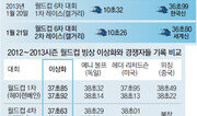 ‘빙속 여제’ 이상화(24·서울시청)가 새해 첫 대회부터 한국 신기록을 작성하며 금메달 행진을 이어갔다. 이상화는 20일 캐나다 캘거리에서 열린 국제빙상경기연맹(ISU) 스피드스케이팅 월드컵 6차 대회 여자 500m 디비전A(1부 리그) 1차 레이스에서 36초99로 가장 먼저 결승선을 통과했다. 2위 헤서 리처드슨(미국·37초12)과는 0.13초 차. 이상화는 2009년 12월 솔트레이크시티에서 자신이 세운 한국 기록(37초24)을 3년 1개월 만에 무려 0.25초나 앞당겼다. 또 위징(중국)이 지난해 작성한 세계 기록(36초94)에도 0.05초 차로 다가가 새로운 기록 작성에 대한 기대감을 높였다. 이날 우승으로 이상화는 올 시즌 여자 500m가 열린 월드컵 모든 대회에서 금메달을 휩쓸었다. 1, 4, 5차 대회 1, 2차 레이스를 모두 석권한 데 이어 이날 6차 대회 1차 레이스까지 7연속 우승이다. 이 종목 월드컵 포인트 700점을 쌓은 이상화는 2위 예니 볼프(독일·436점)와의 격차를 더욱 벌리며 시즌 종합 우승에도 한발 더 다가섰다. 이헌재 기자 uni@donga.com}